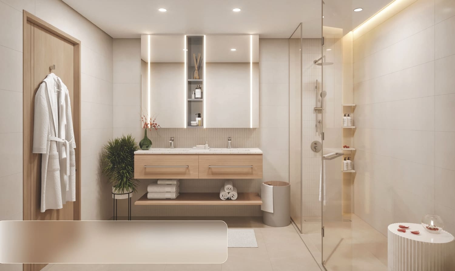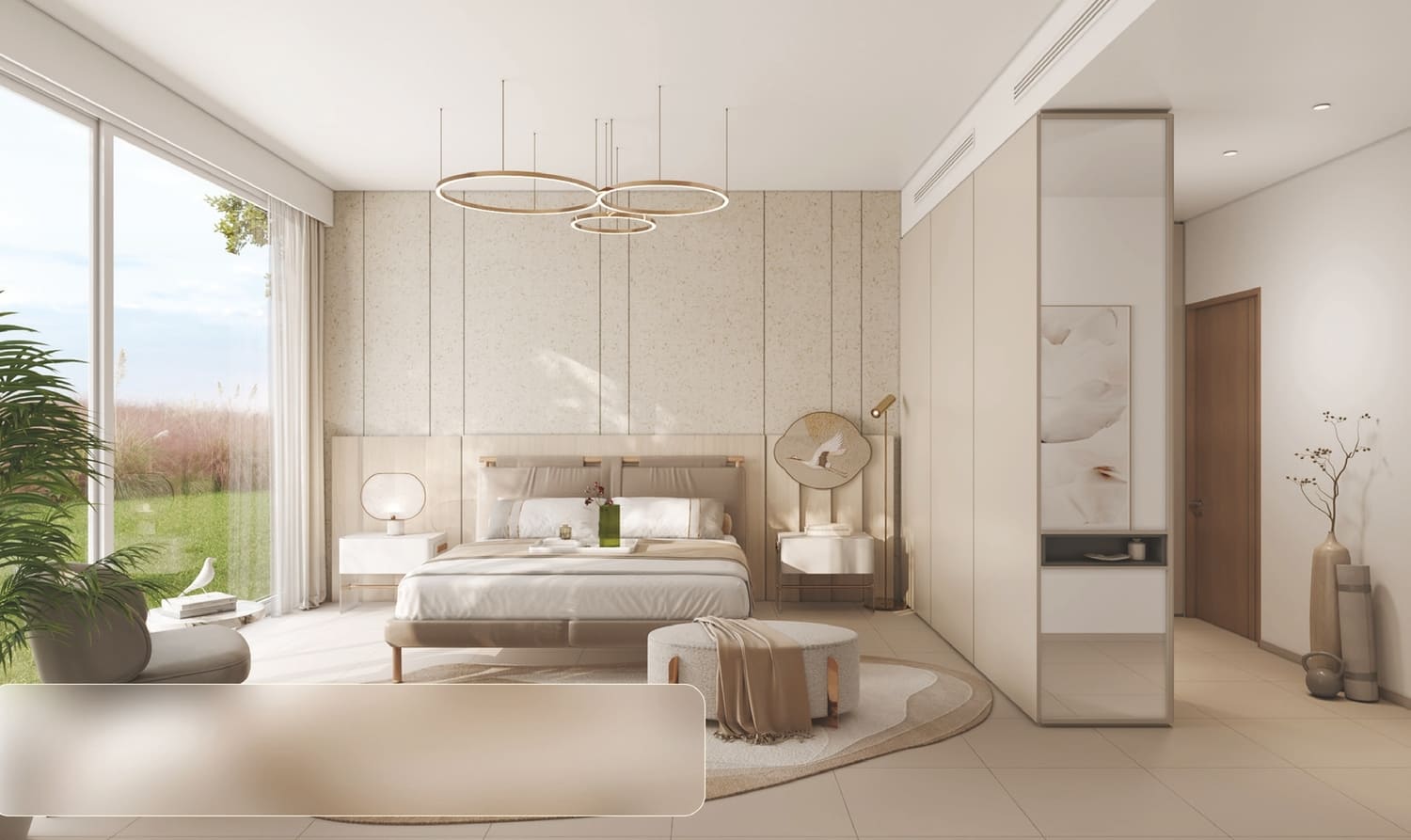 The interiors of the modern elegant apartments at Arbor View are designed to exude sophistication and style. In the bedrooms, the flooring is finished with sleek porcelain tiles, adding a touch of style. The glass cabinet doors feature high-quality prefabricated aluminum frames with integrated hardware, showcasing meticulous craftsmanship. The incorporated lighting illuminates the space, while the wardrobes come with integrated mirrors, safes, and wide drawers, providing both functionality and elegance. Natural daylight streams in through the floor-toceiling windows, creating a bright and airy ambiance. The color palette of the bedrooms is dominated by soothing beige neutral tones, promoting a tranquil atmosphere.
