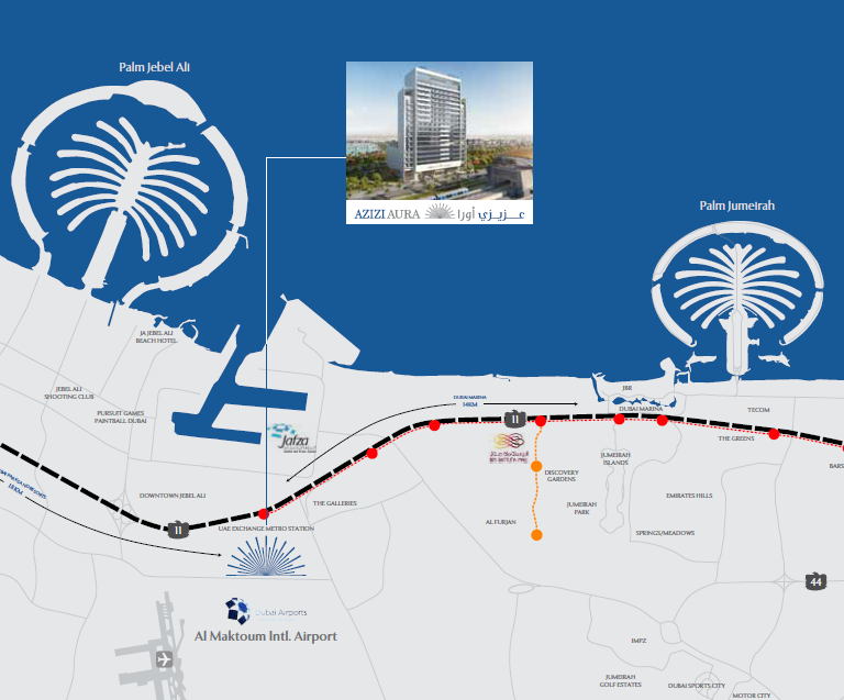Located in the suburbs of Dubai, near lush sea lands, Aura is close to Abu Dhabi. The complex is located opposite Jebel Ali Metro Station and is in close proximity to JAFZA. Aura residents will have both convenience and security.