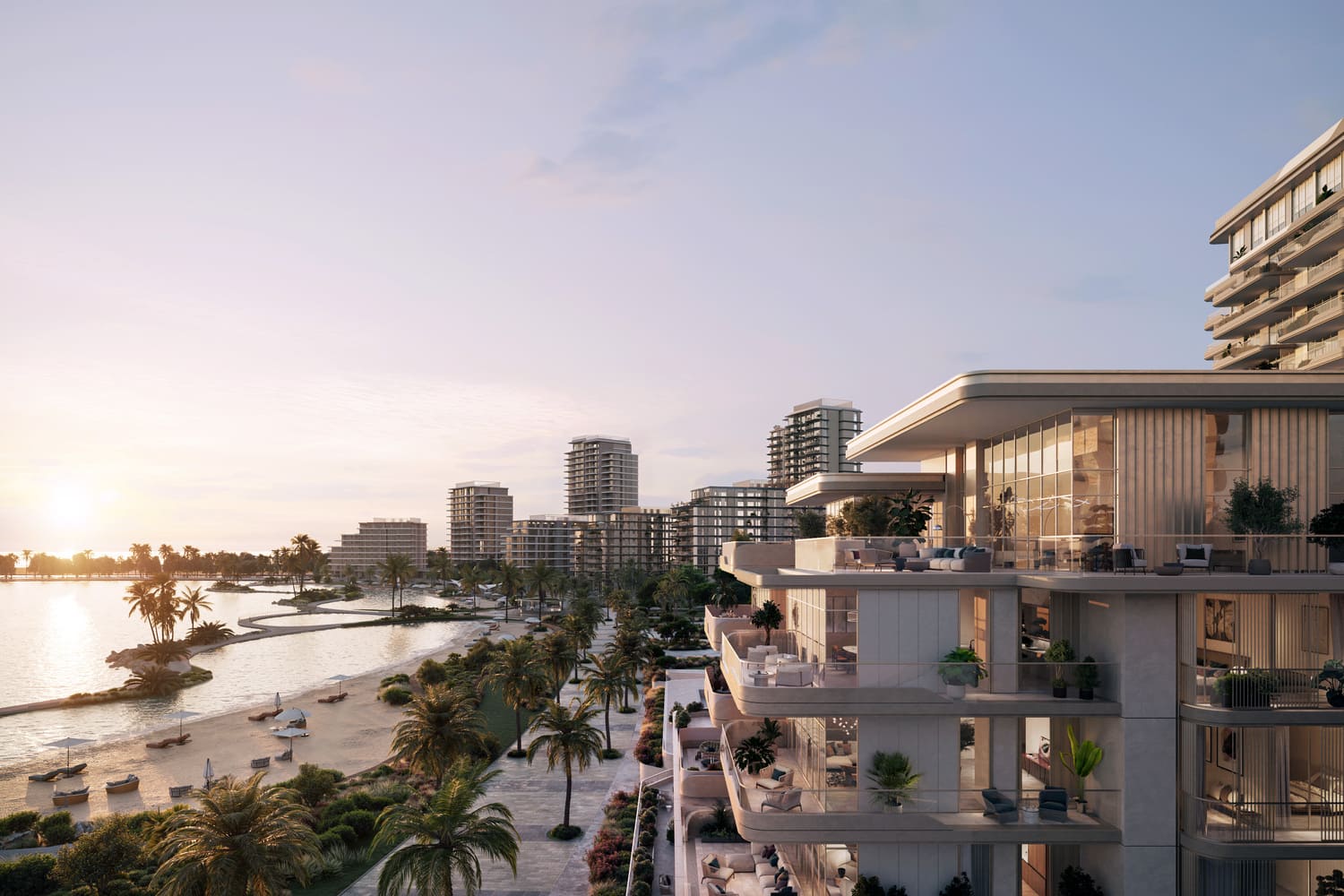 The residences include 1-, 2-, 3-, and 4-bedroom apartments, as well as an exclusive penthouse, all framed by expansive terraces and floor-to-ceiling windows. Elegant interiors showcase warm wood textures, light stone finishes, and soft, modern tones that reflect the serenity of island life. Building 15 stands as a centerpiece, offering premium 4-bedroom homes and private lobbies, while every unit is thoughtfully designed to blend privacy, comfort, and timeless style.