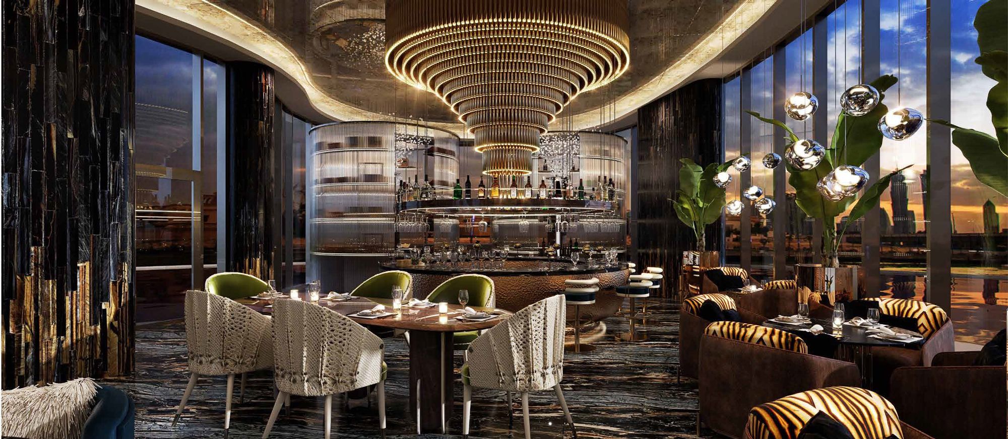 Attitude is flaunted at Cavalli Couture. While the terraces, pools and foliage of the building's exterior bring the jungle dubai to Dubai, the inside of the landmark is equally flamboyant, with world-renowned fashion brand Cavalli designing every aspect of the interior. Here the walls and upholstery are adorned with signature animal prints and natural motifs that swagger with confidence.