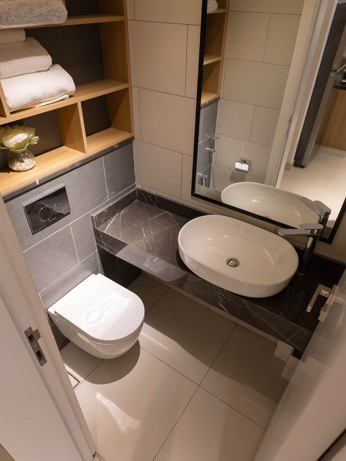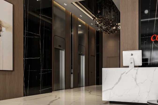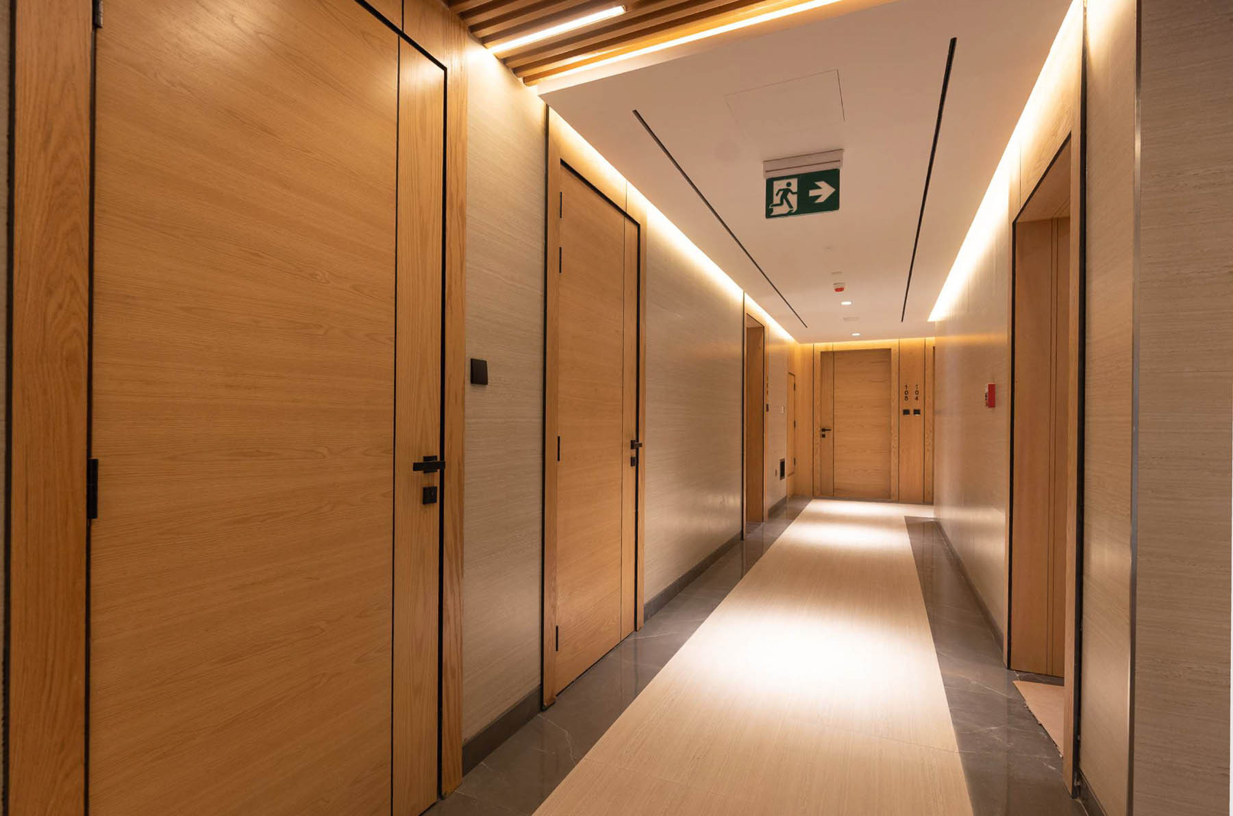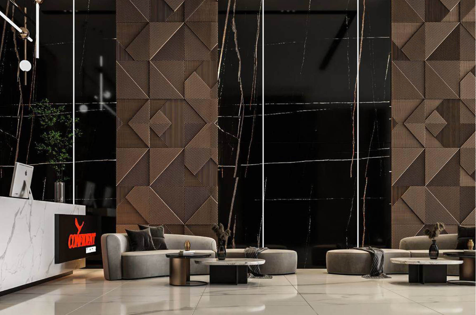 The lobby's design exudes opulence with its generous use of rich wood paneling and the striking presence of black bamboo stone elements. The combination of these materials creates a harmonious blend of warmth and contemporary style. In every apartment at Confident Lancaster, attention to detail shines through in the woodwork. Meticulously crafted fixed furniture not only enhances the aesthetics but also provides functional elegance.
