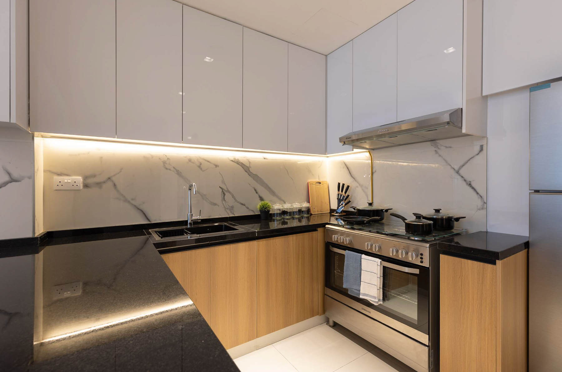 The kitchens are equipped with Samsung's premium range of appliances, including a gas stove, oven, 460L fridge, and a convenient 7KG washing machine. These high-quality appliances are thoughtfully placed within the kitchen for residents' convenience and efficiency in their daily routines.