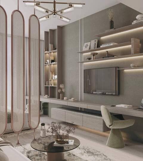 Within this haven, elegance and modern allure meld effortlessly. Soft hues, ambient lights, and rose gold whispers beckon, inviting you into a realm of refined living.A room adorned with whispers of style and comfort, where each piece narrates stories, inviting tranquility and a sense of home.
