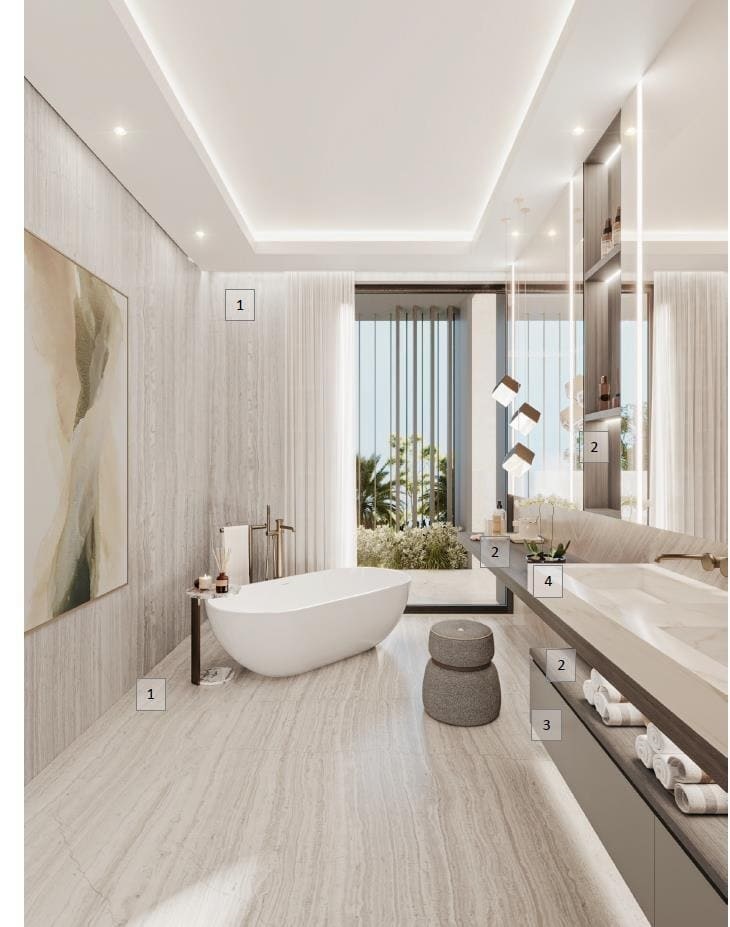 Bathroom: Porcelain tiled floors and walls -all bathrooms. Sanitary ware and fittings. Vanity with under tier cabinet and stone countertop. Glass enclosures - Shower / WC. Mirror –All bathrooms