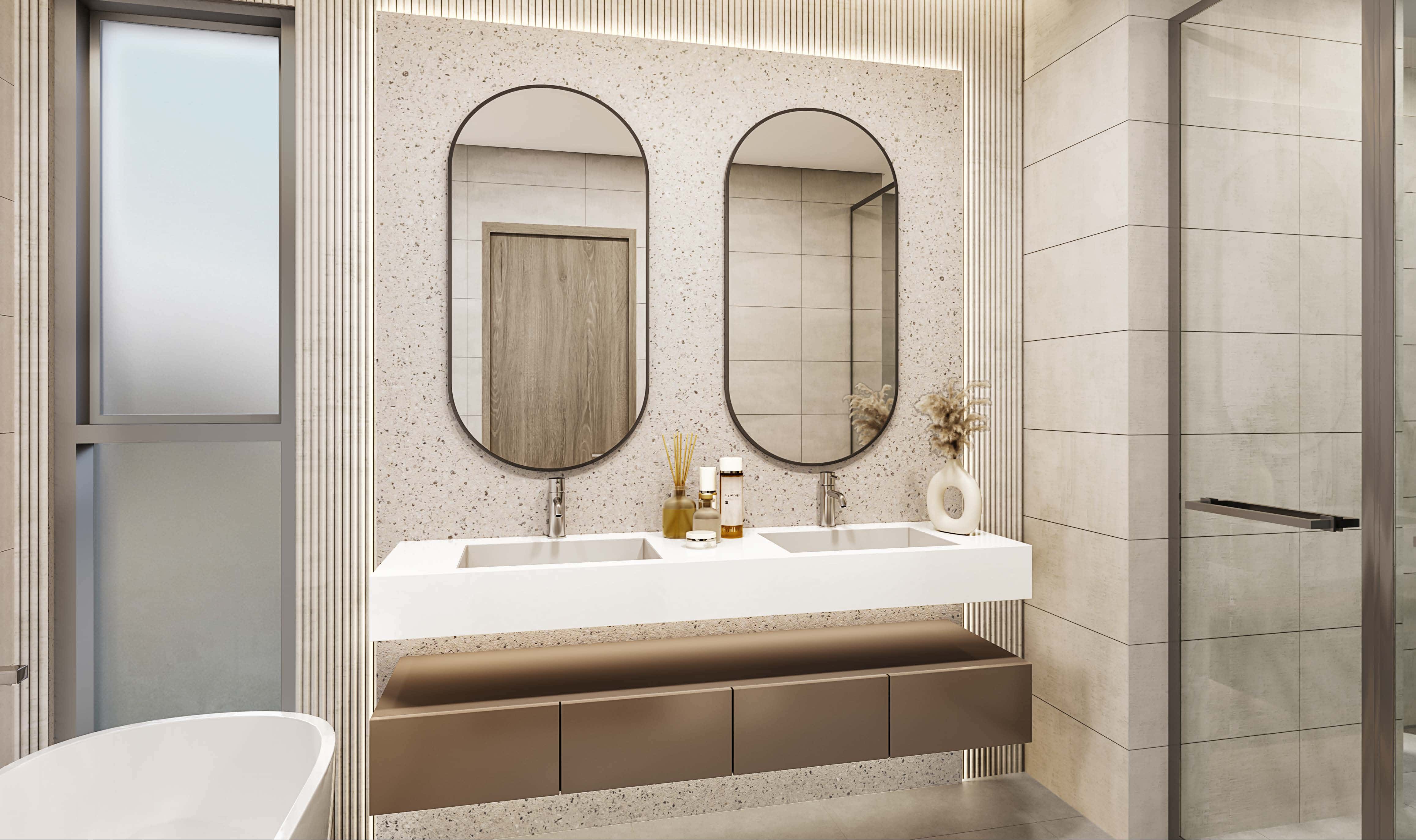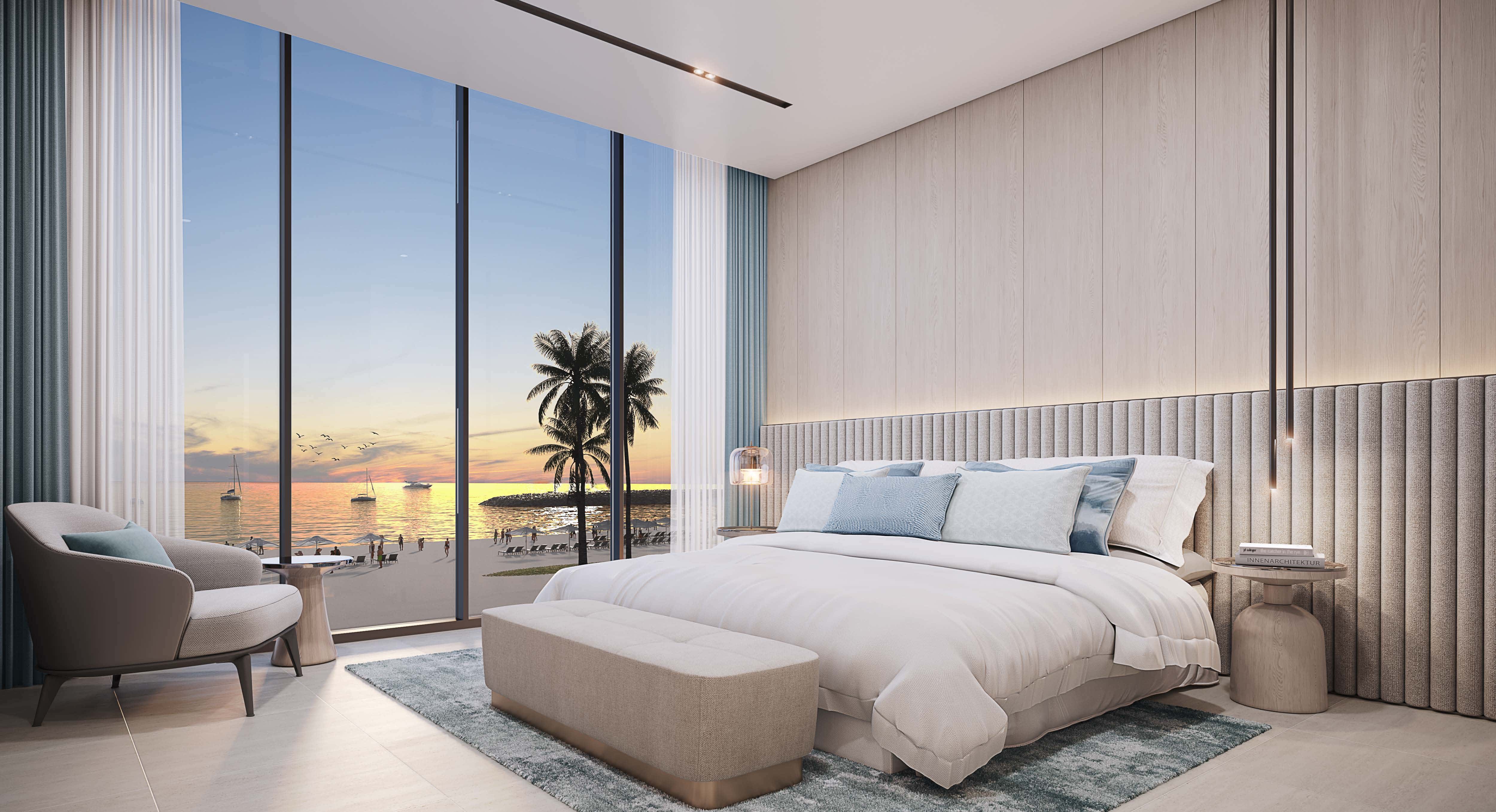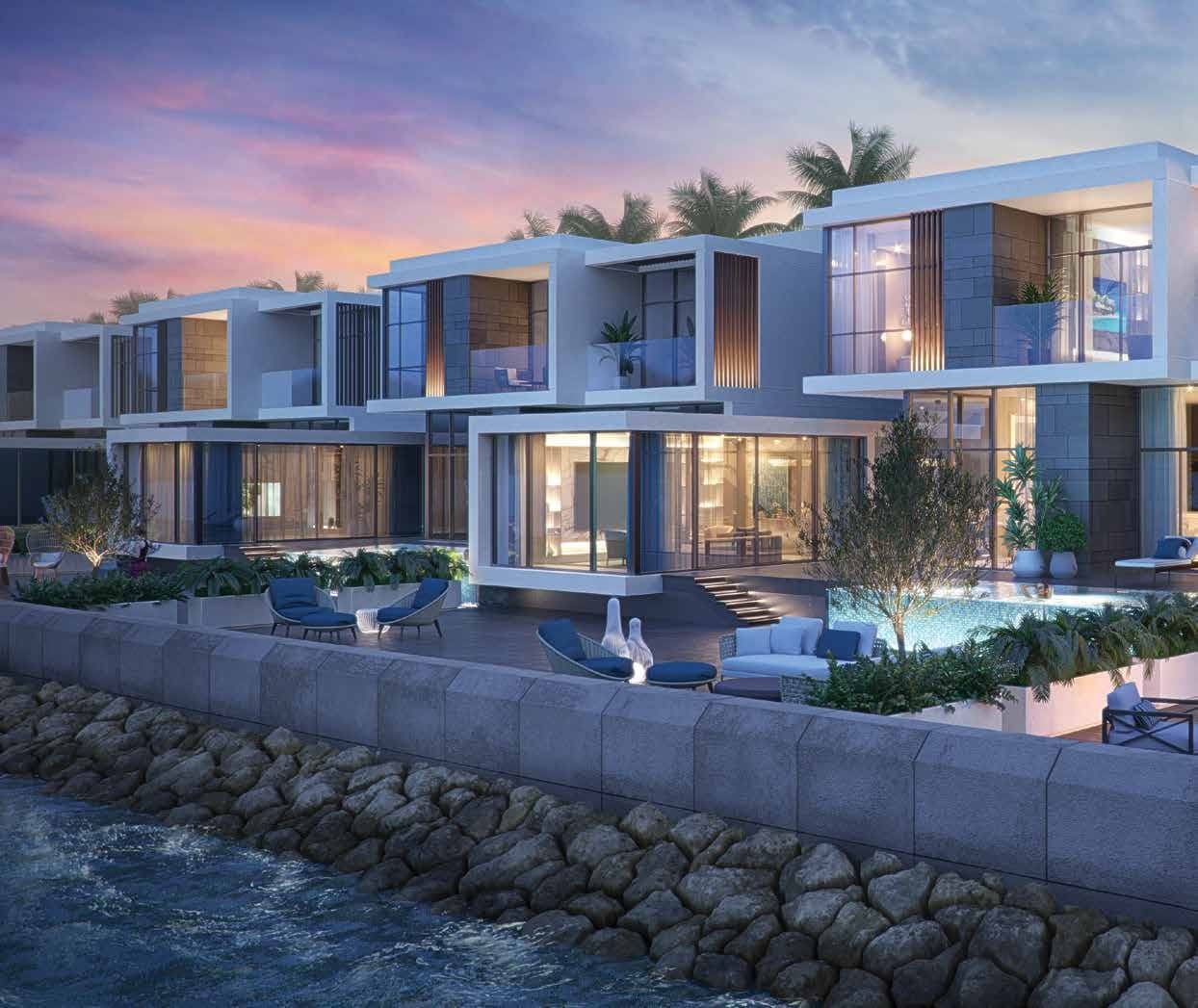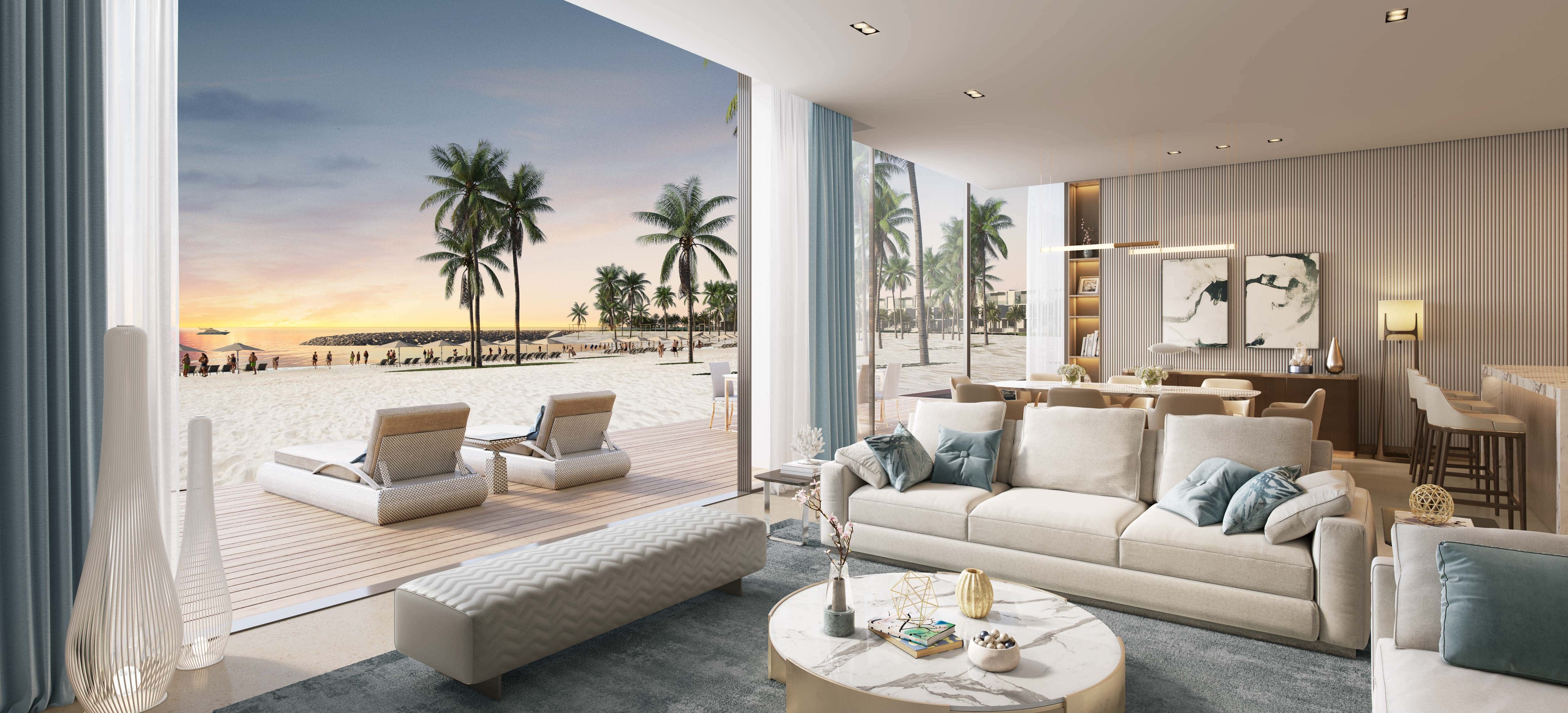 Villas&Townhouses. The interiors make a statement with their open plan living, dining, and kitchen space and the showpiece staircase links the ground level and the first floor with an accent stone wall. Echoing a high-end beach resort inspired feel, the interiors feature modern materials and details. Every detail makes life here extraordinary and carefree. Watch the sunrise from one of the expansive and luxurious 4-bedroom villas with direct beach access or an incredible first-row sea view.