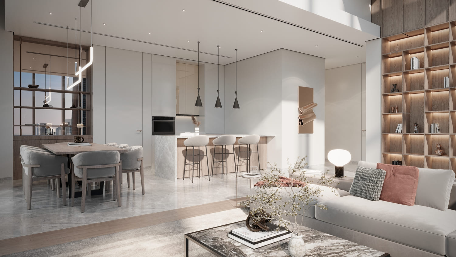 Architecturally, DIFC Heights Tower stands as a bold statement of modern sophistication. Its striking design, marked by interlocking geometric forms and lush green terraces, blends perfectly with its surroundings while maximizing breathtaking city views. Every residence features floor-to-ceiling windows, pastel-toned interiors, and impeccable finishes, creating warm and inviting spaces filled with natural light.