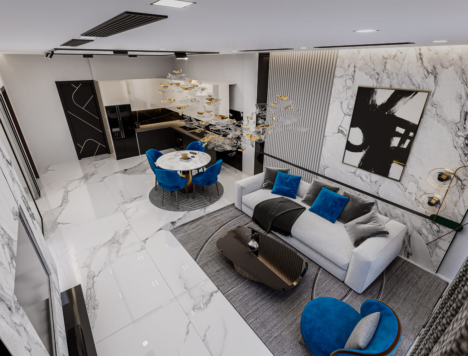 Every detail is meticulously crafted to evoke a sense of refined elegance. A spacious living room with enchanting interiors for relaxation, social gatherings, and making cherished memories in the lap of indulgence.