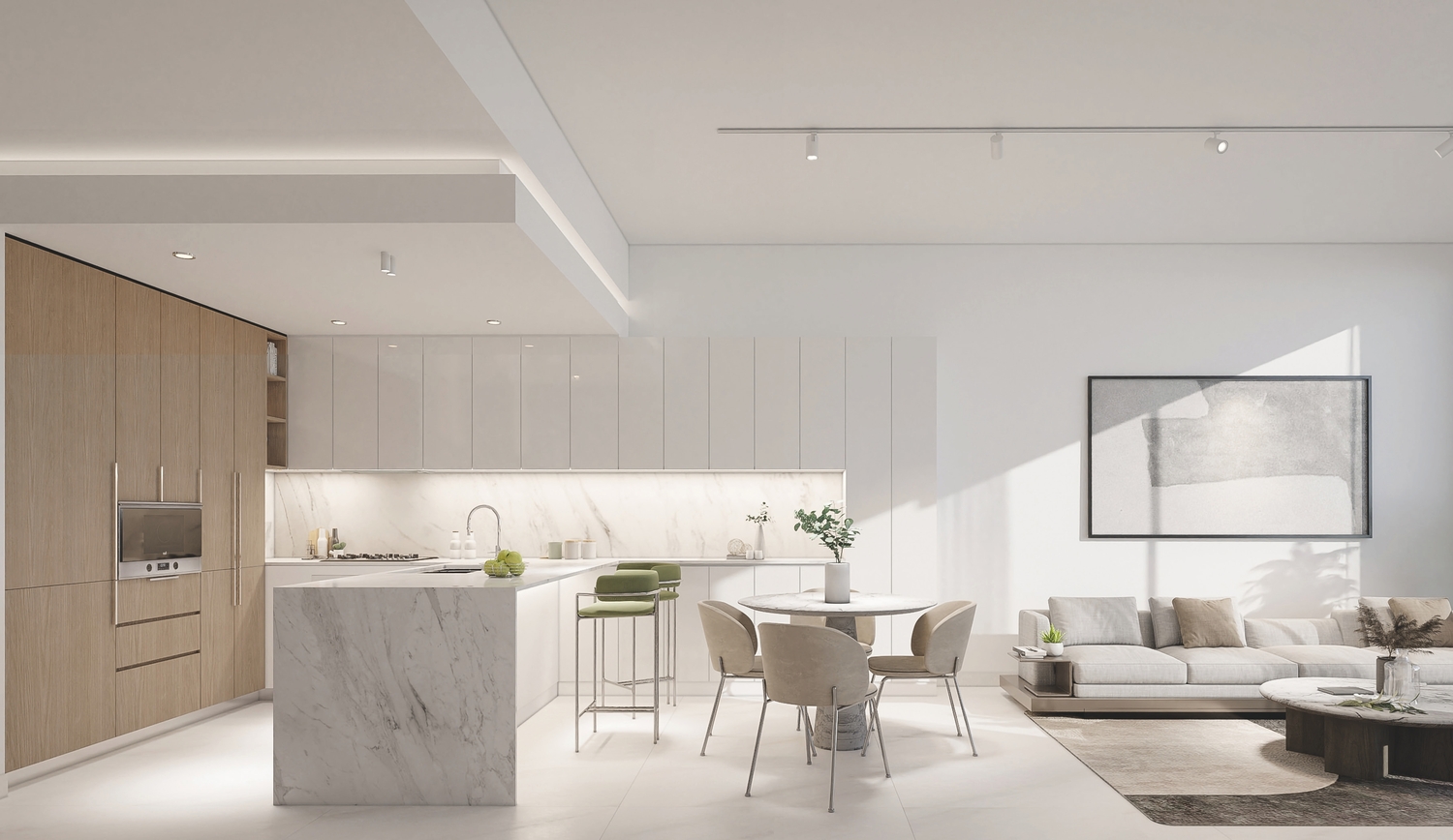 Great care and attention were taken in designing the kitchen at Ellington House IV. A wellcrafted and thoughtfully designed space that combines both style and function. Its openconcept design that merges with the living room and the signature countertop made of marble adds elegance and sophistication to the kitchen. While the wood cabinets add warmth and depth to the design.