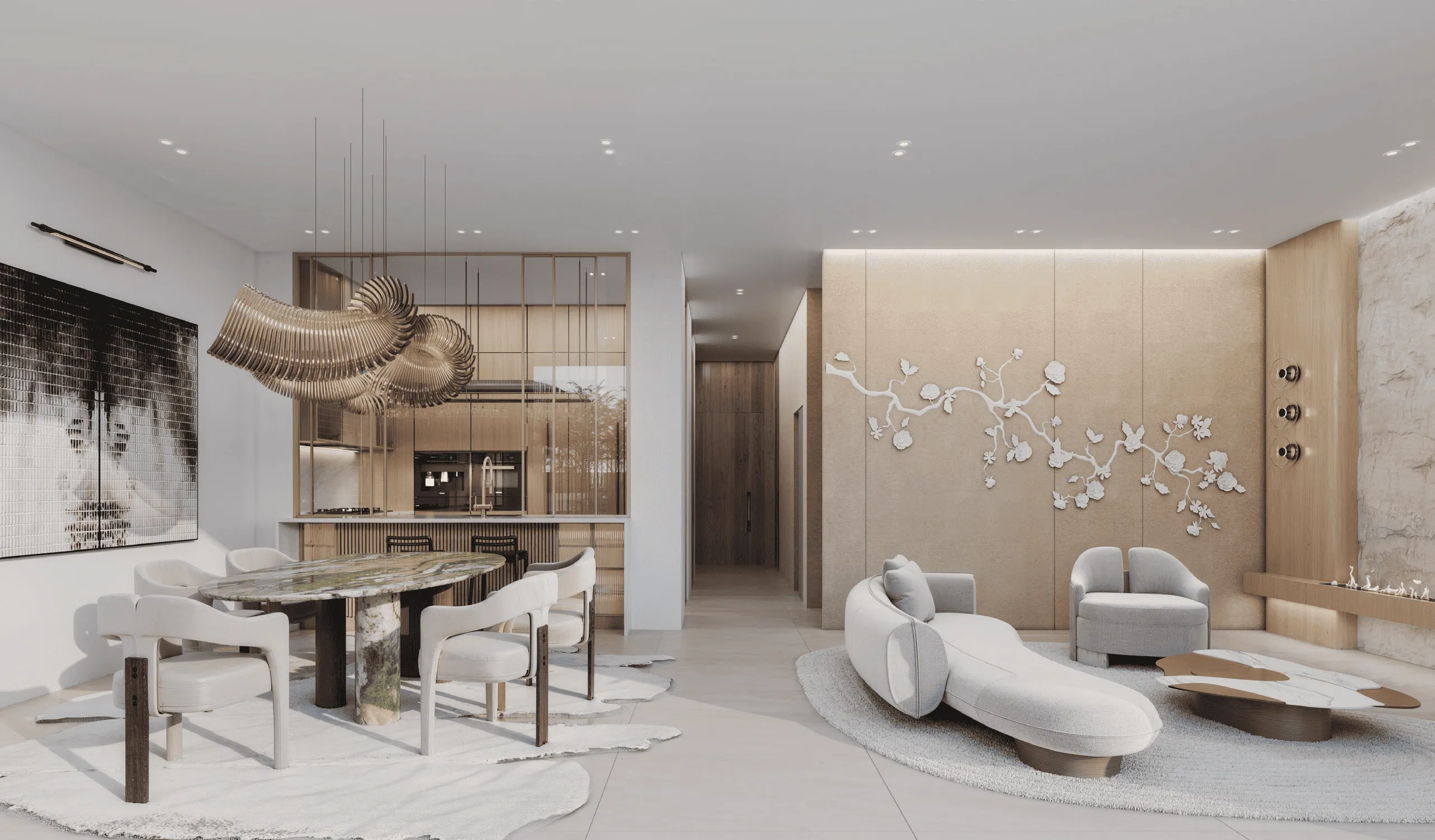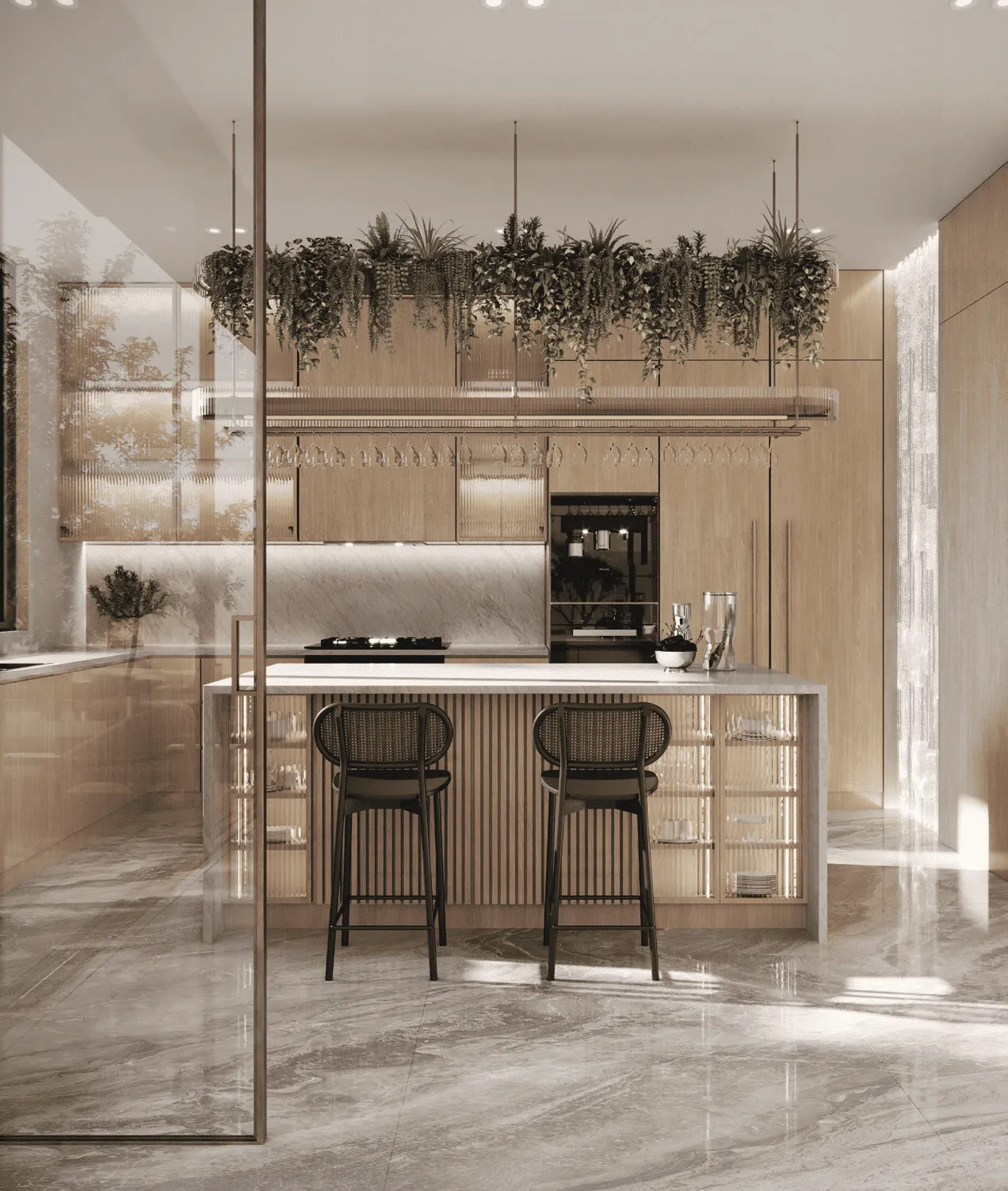 Interiors are designed with soft natural light, refined materials, and quiet luxury that can be felt in every space. Kitchens feature elegant finishes, smooth surfaces, and contemporary layouts that blend function with beauty. Warm timber, gentle stone textures, brushed metal details, and large glass openings come together to create interiors that are modern, soothing, and crafted with exceptional attention to detail.