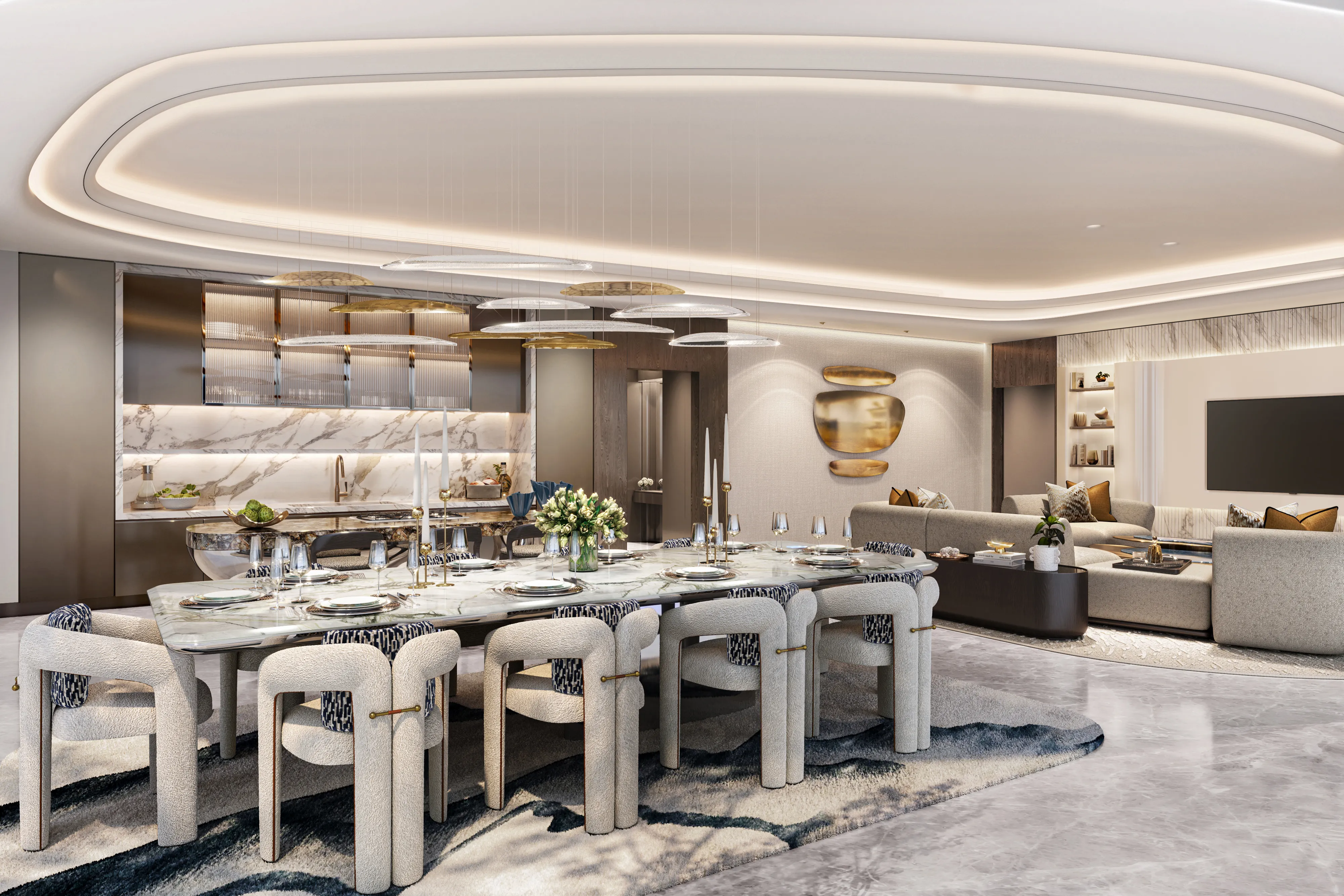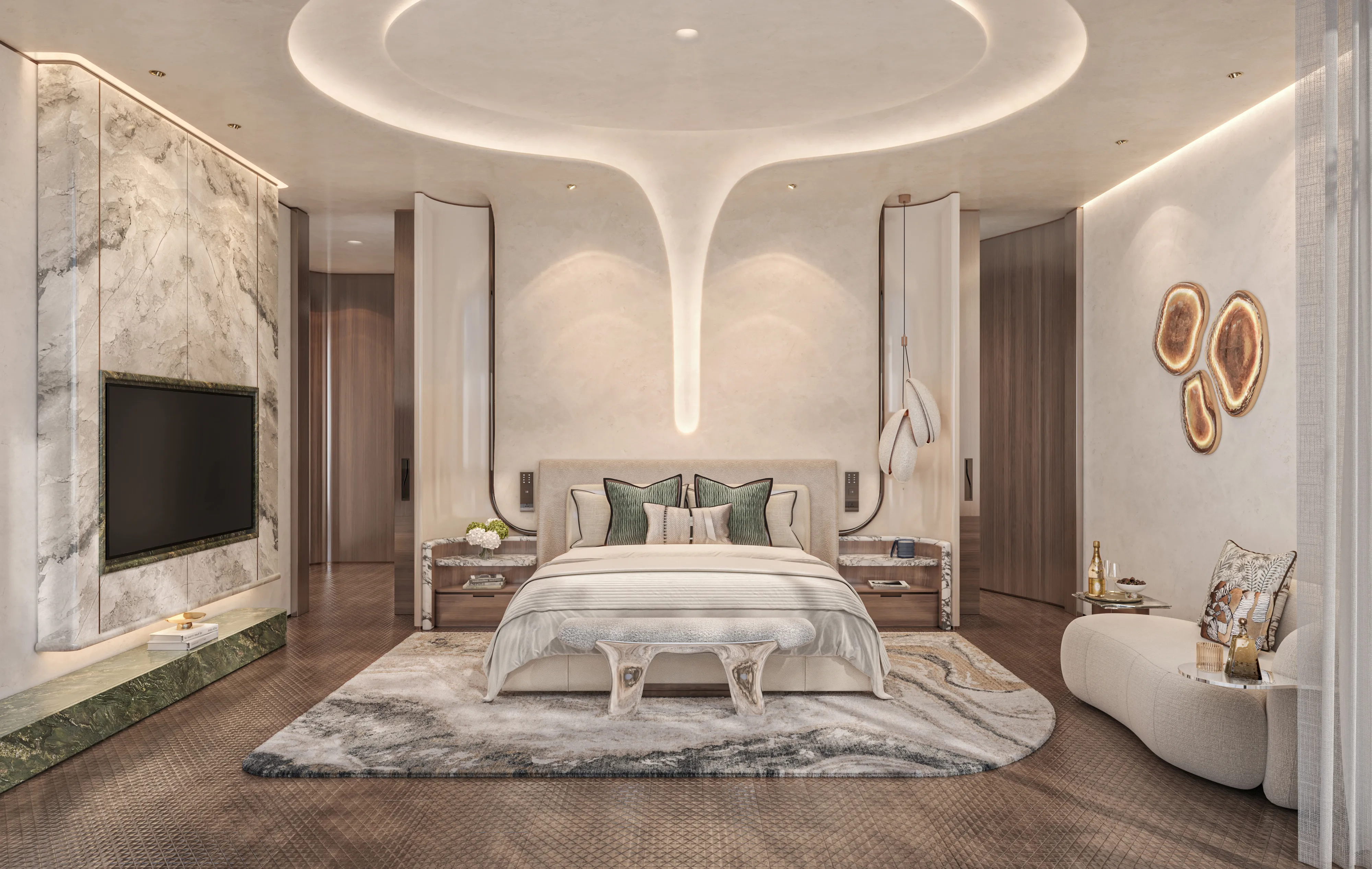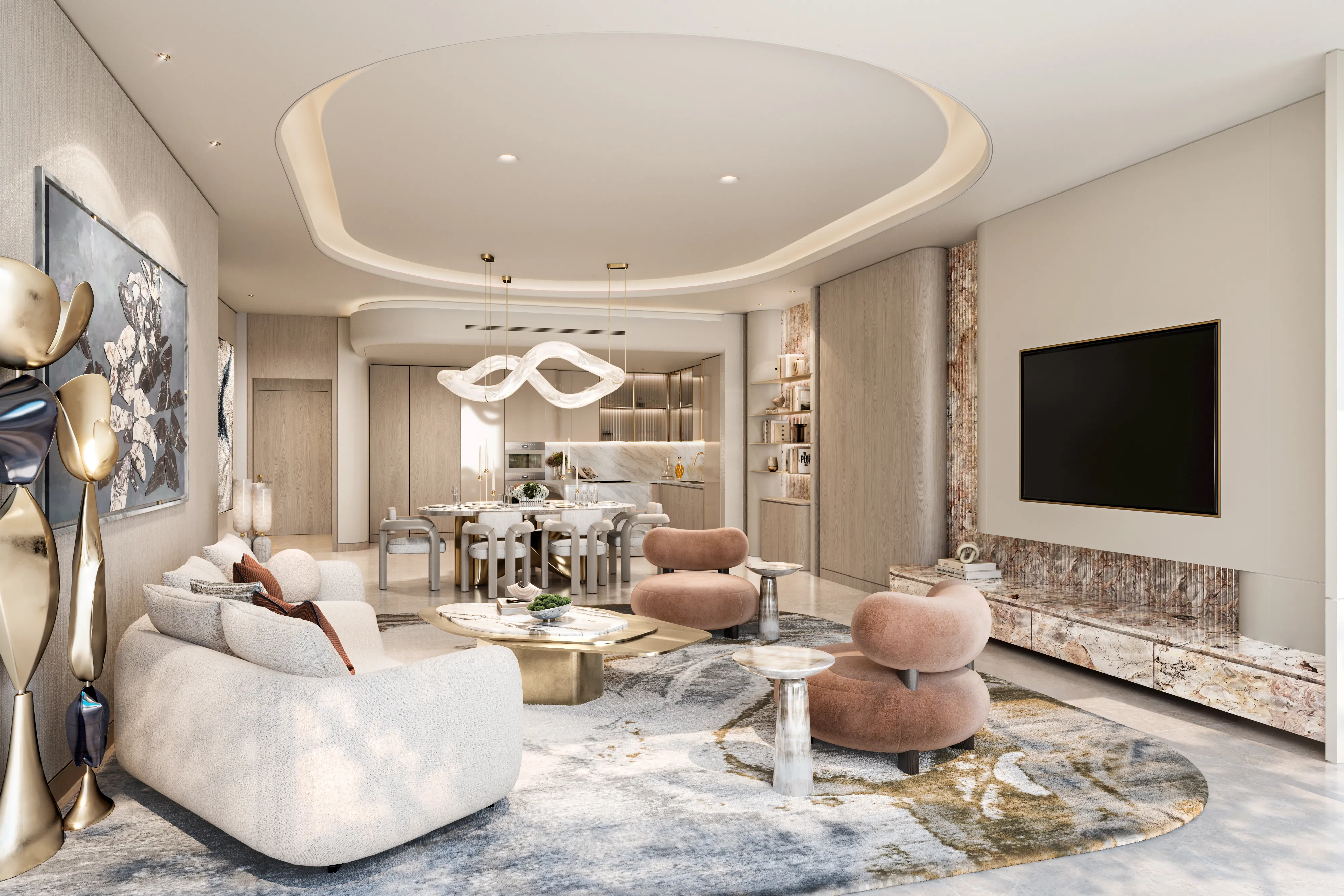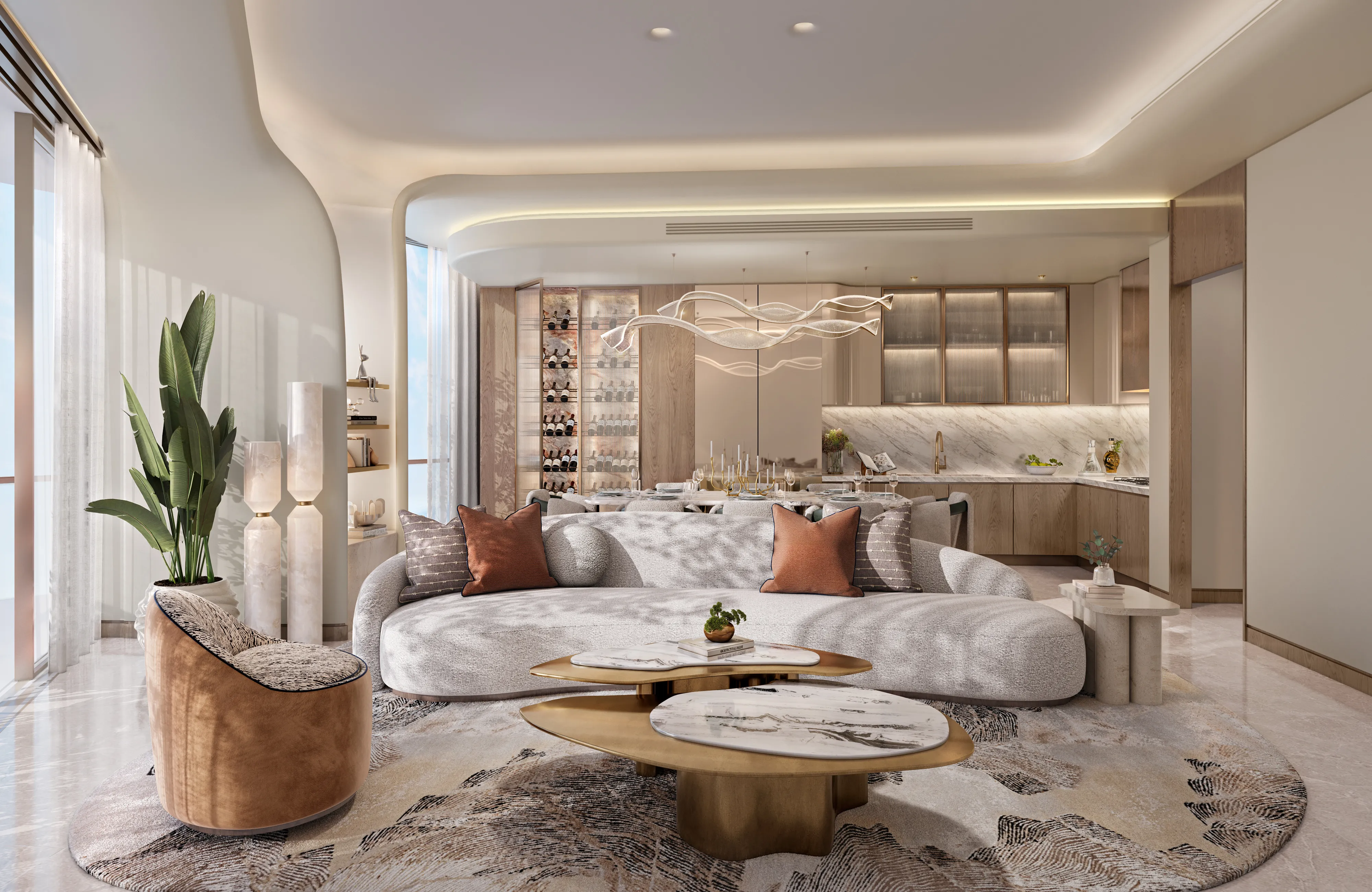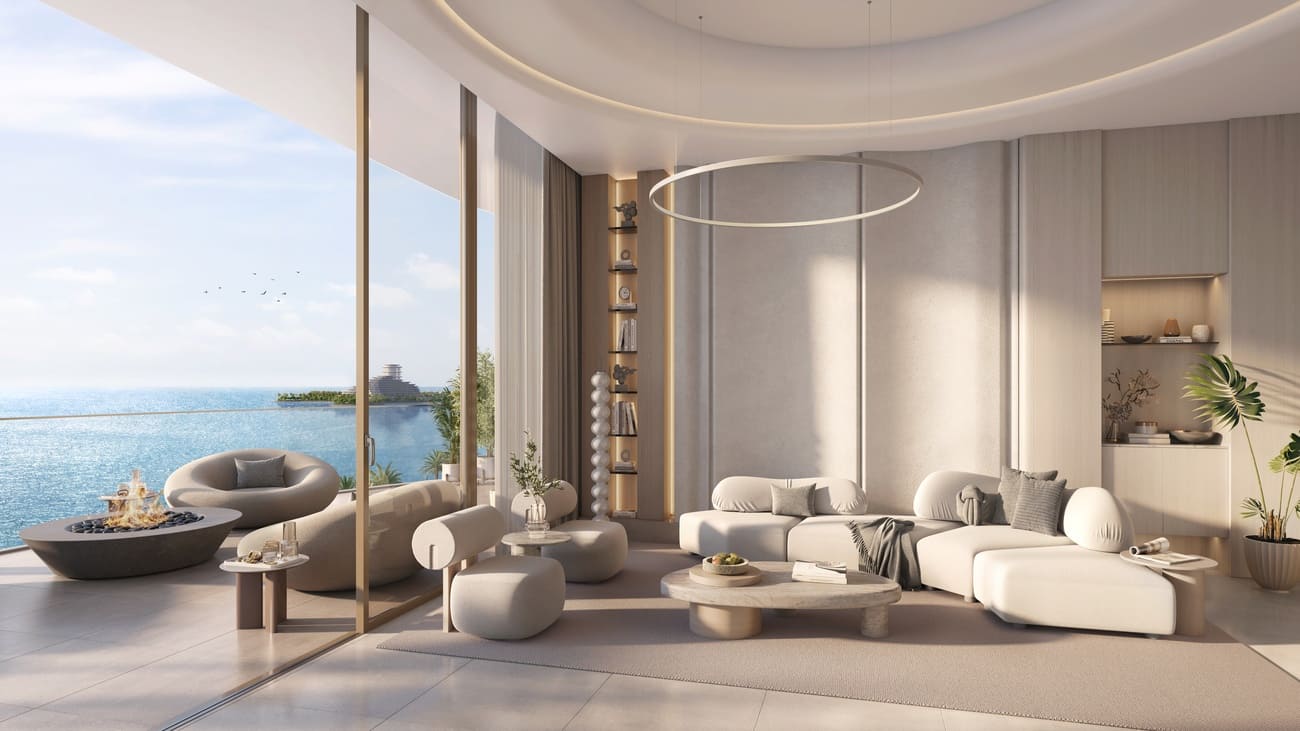 Oystra's interiors are crafted to reflect the project's overarching concept of fluidity and organic form. The design language seamlessly blends luxury and natural elements, creating spaces that feel both refined and welcoming. The aesthetic is modern, with a focus on curvature, softness, and understated elegance.