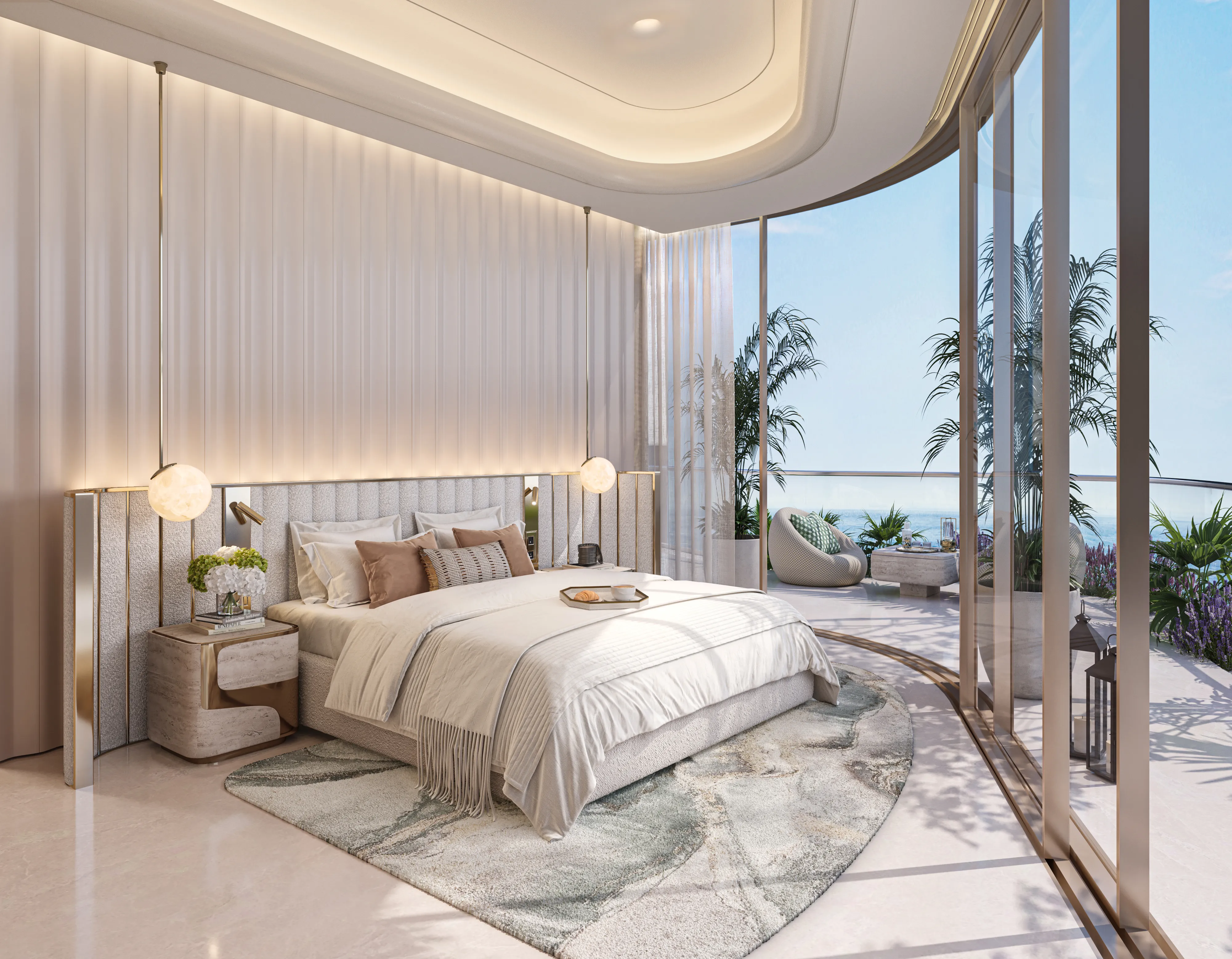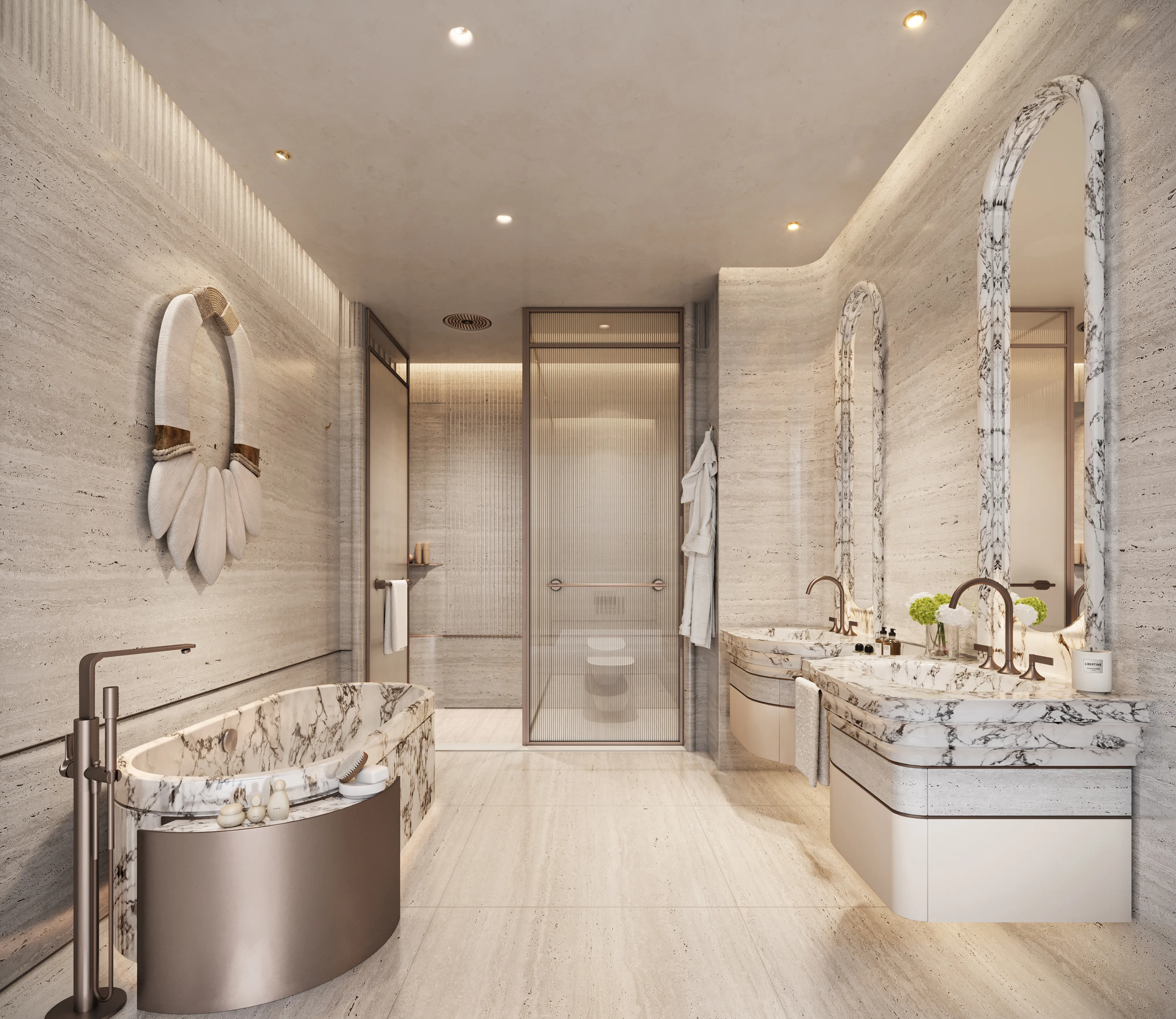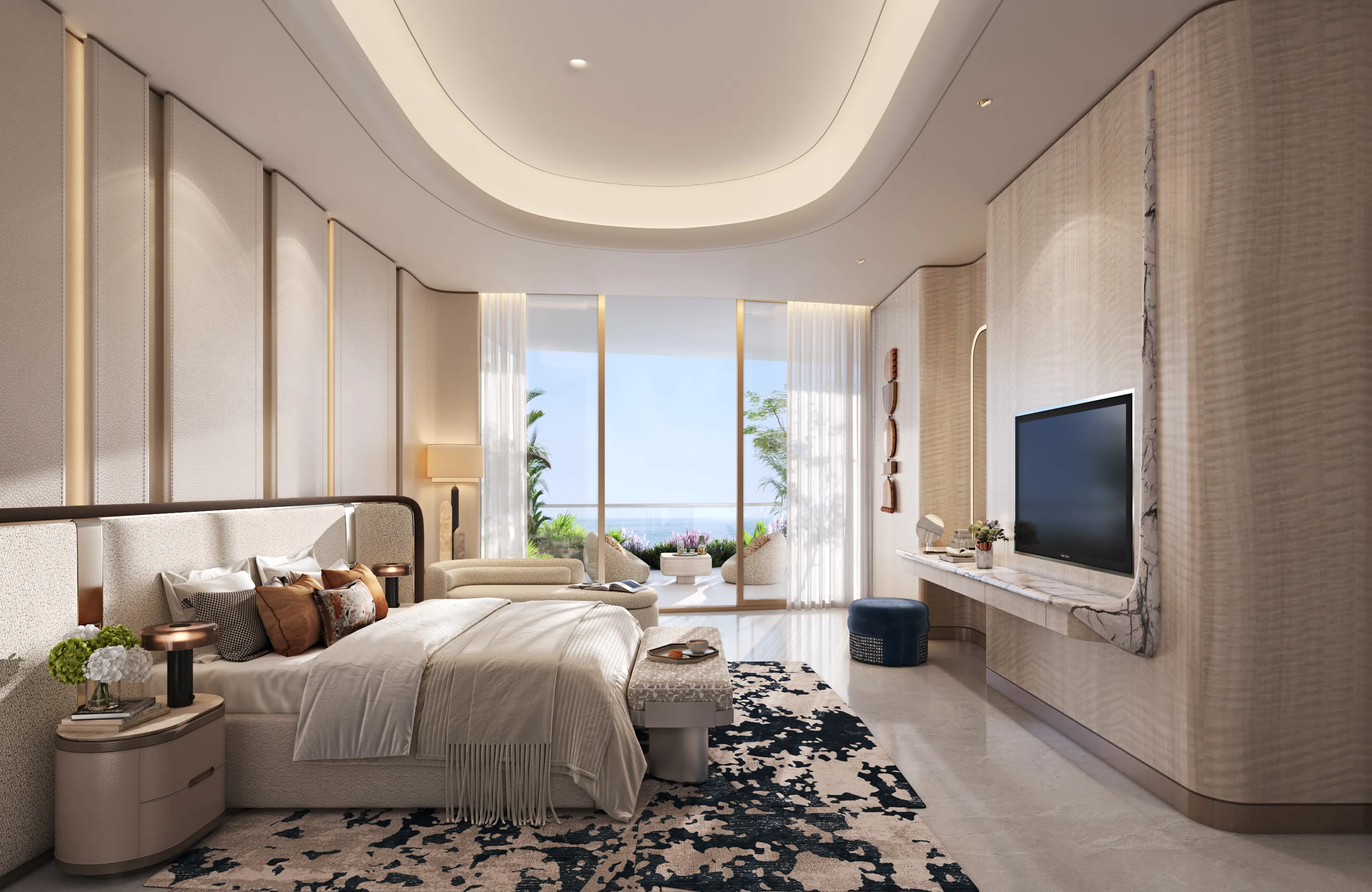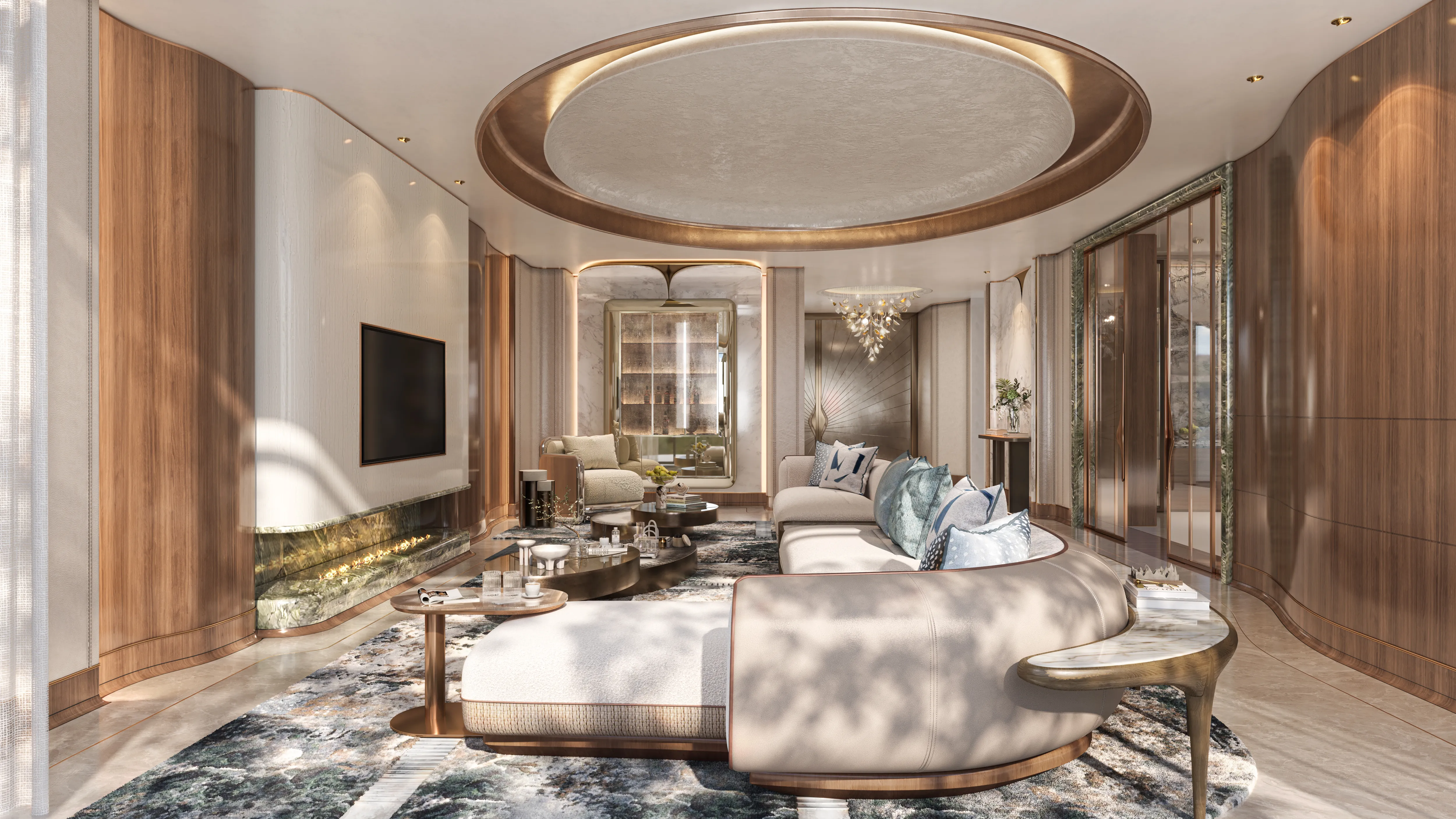 Oystra's interiors are crafted to reflect the project's overarching concept of fluidity and organic form. The design language seamlessly blends luxury and natural elements, creating spaces that feel both refined and welcoming. The aesthetic is modern, with a focus on curvature, softness, and understated elegance.