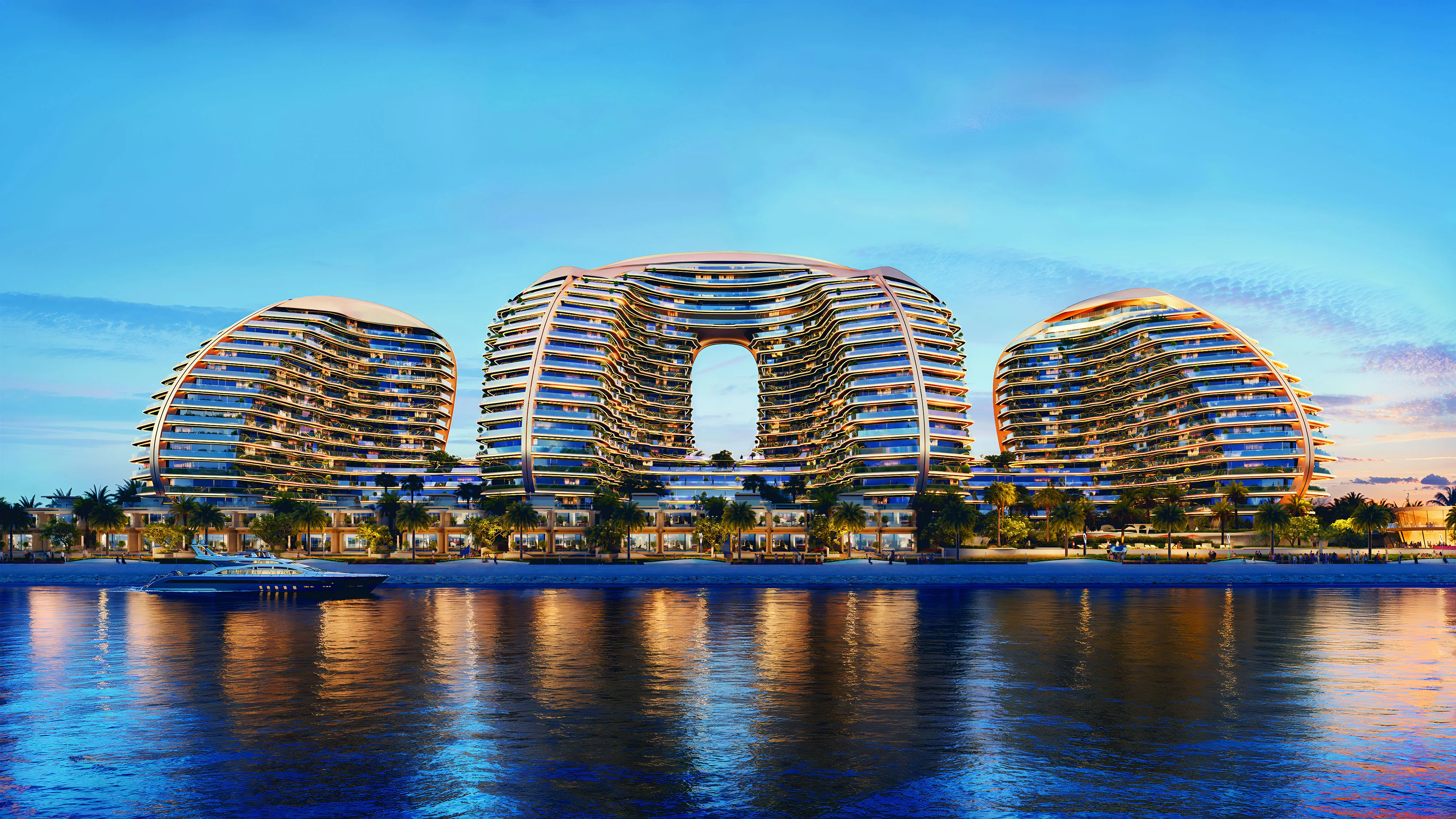 Designed a s a living sculpture, Oystra embodies the idea of movement. Its curved facades, flowing balconies, and seamless transitions are inspired by the natural flow of water. This visionary approach allows the building to blend effortlessly with the surrounding landscape while standing out as an iconic structure on Al Marjan Island.
