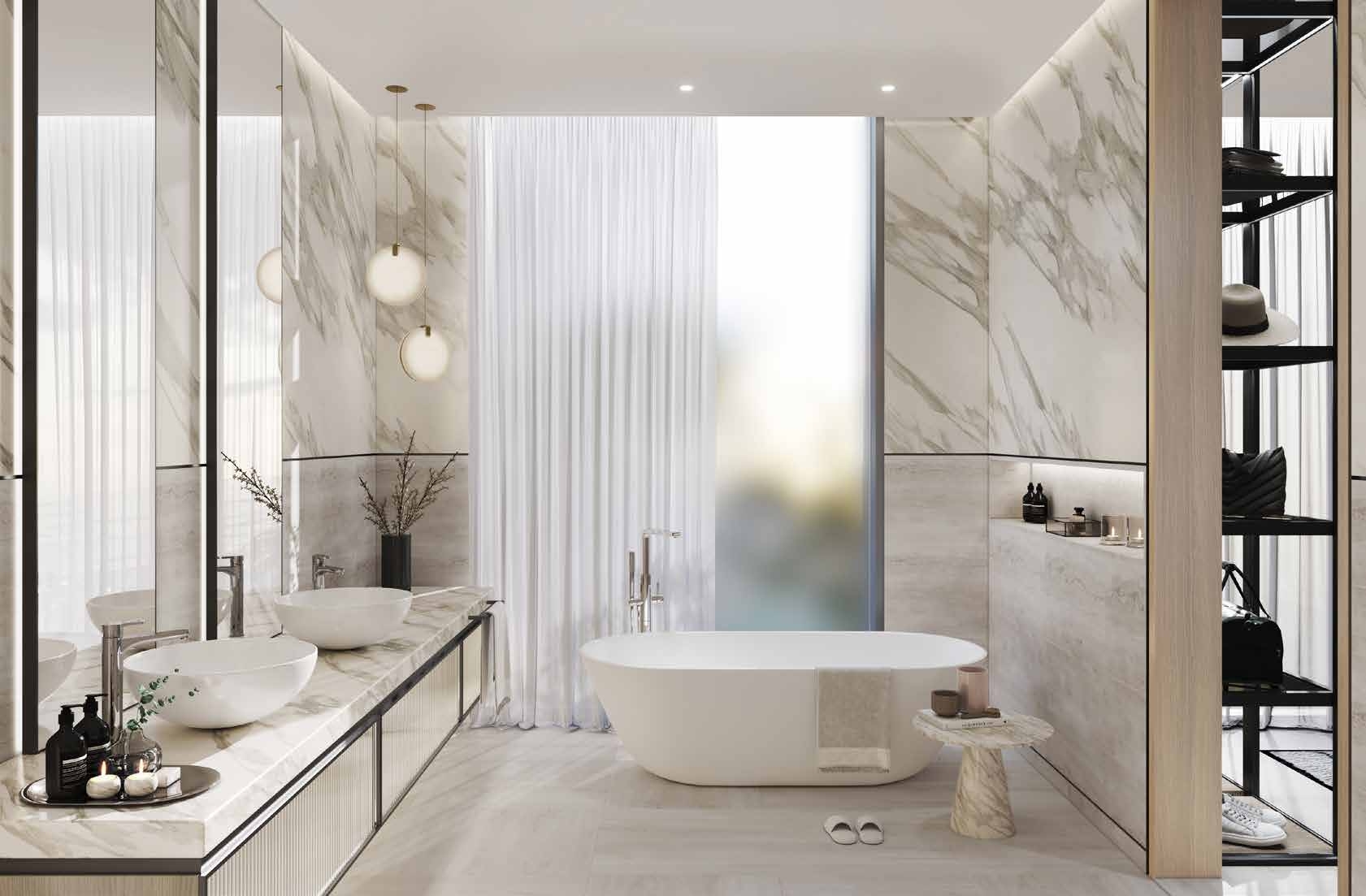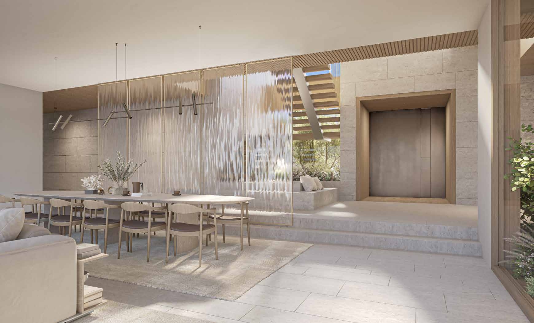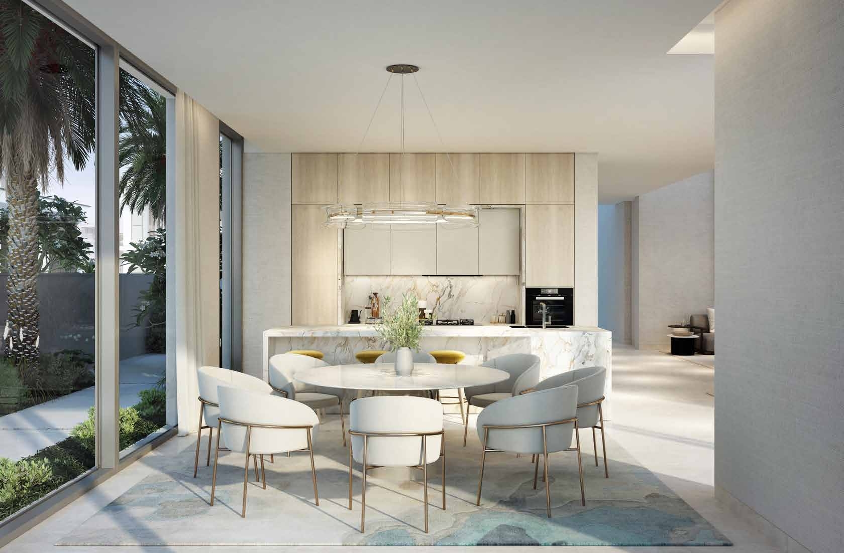 Precious natural materials embellish the interiors of the show kitchen with appliances, whilst the extensive floor-to-ceiling glazing brings the outdoors inside so that every moment is enriched with natural sunlight.