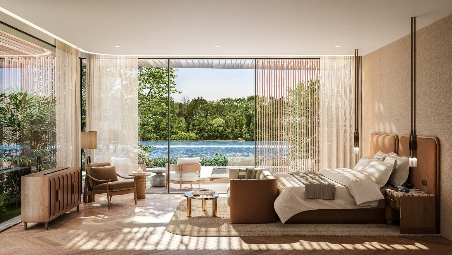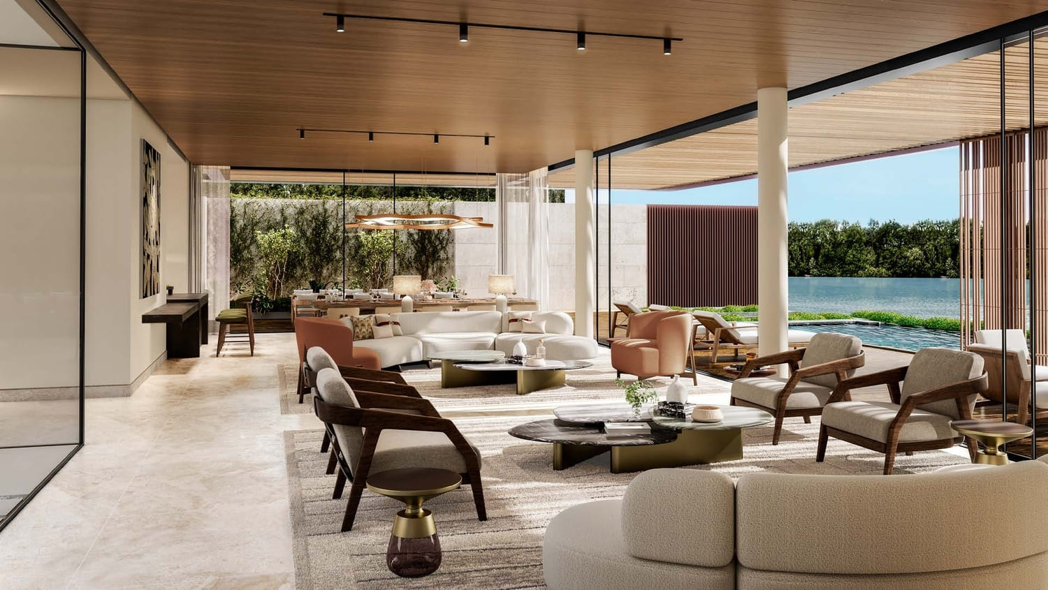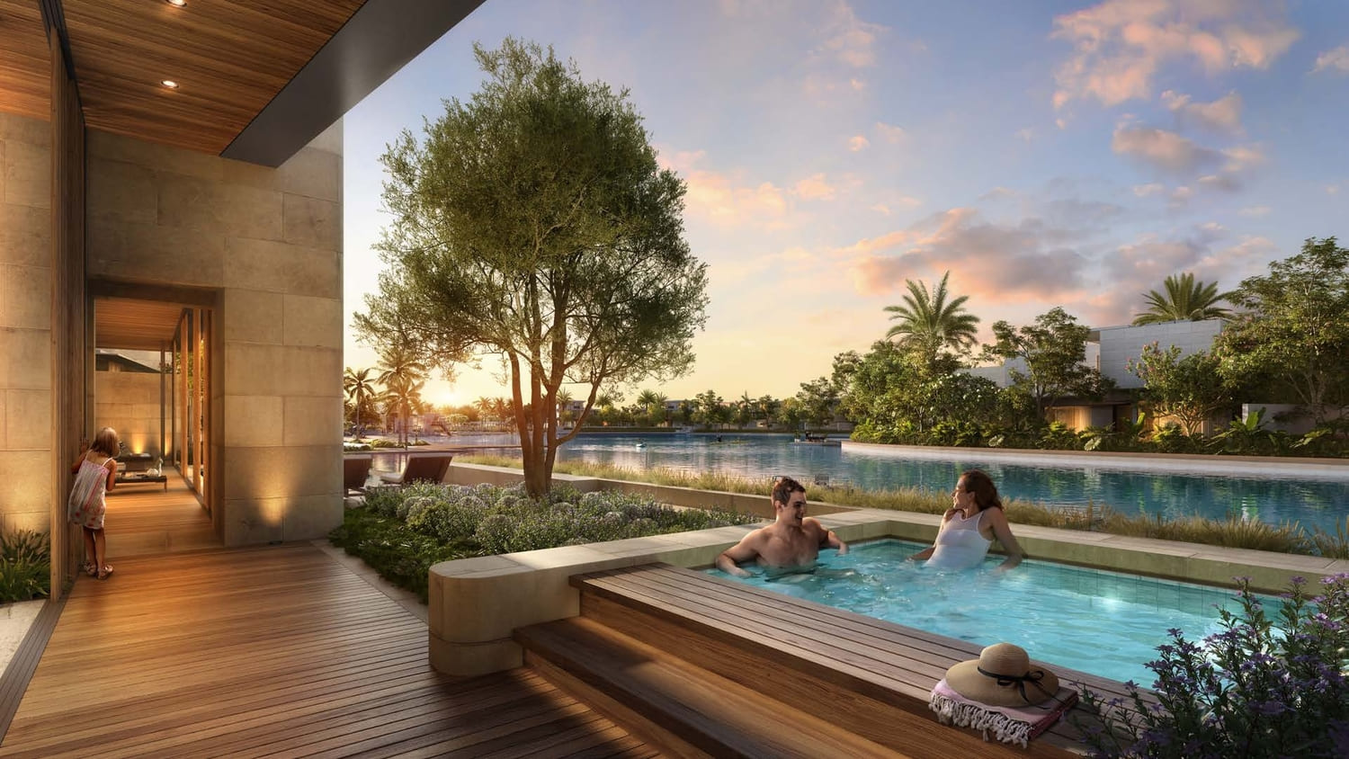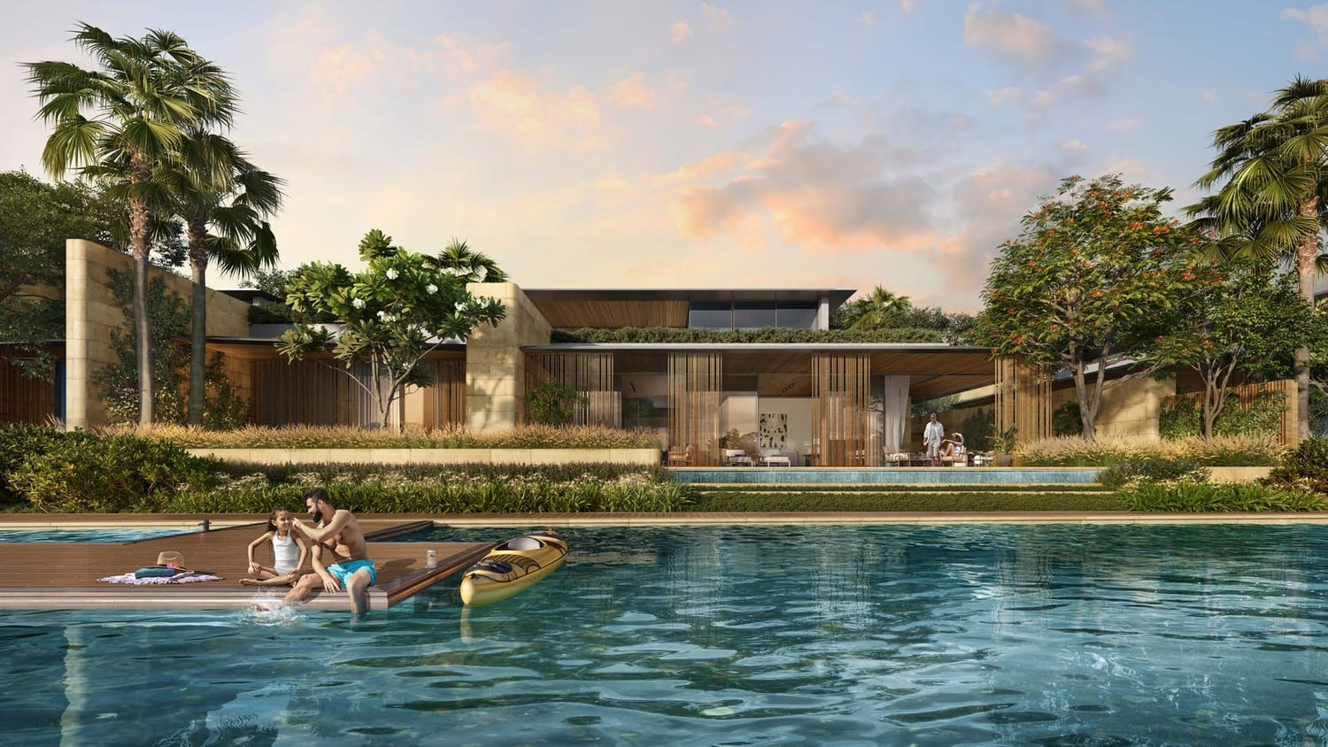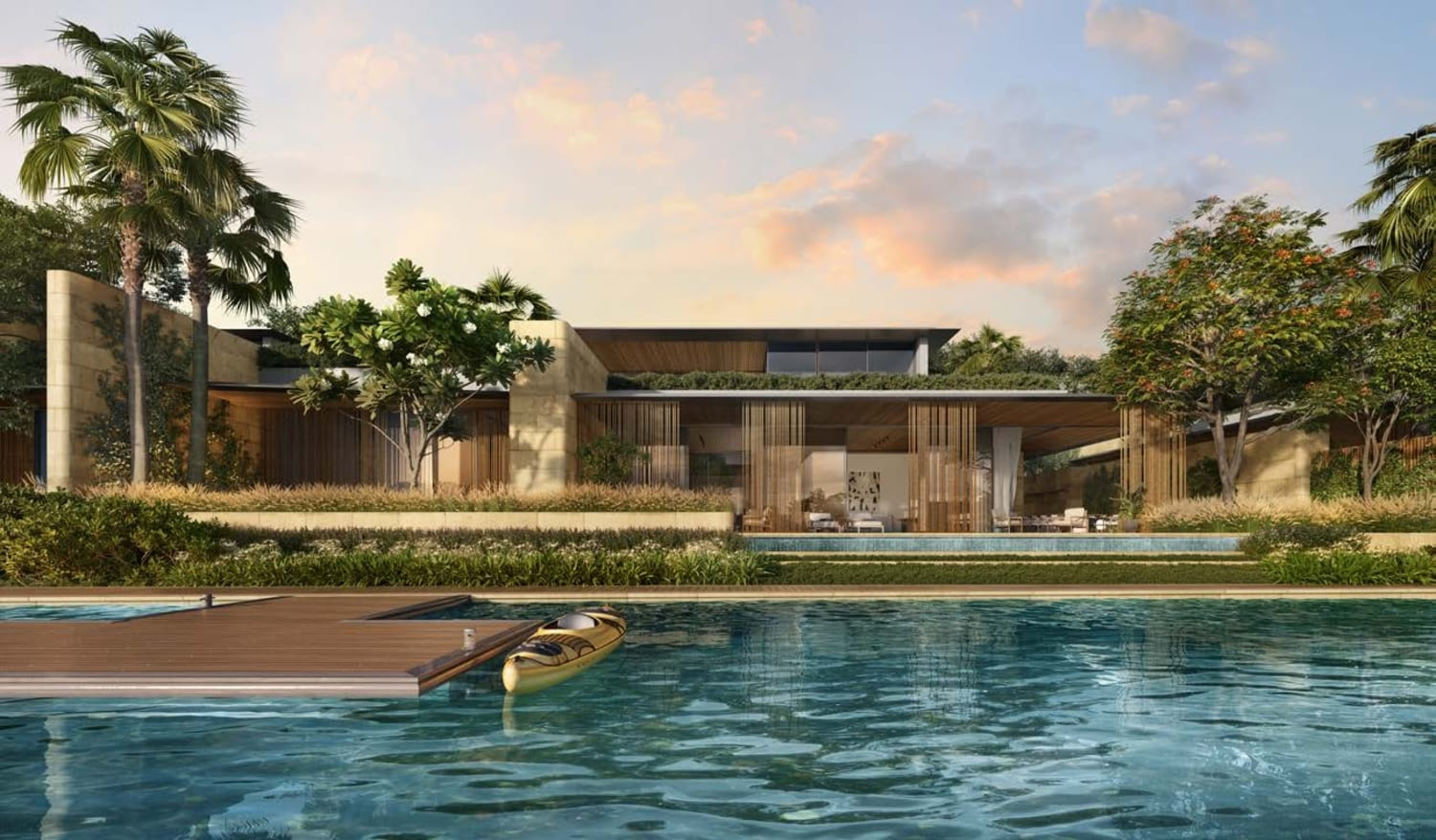 Bespoke with a French touch, these 28 three-floor villas follow the snaking contours of the masterplan. They introduce greenery into the living quarters, oriented towards the lagoon on one side, and the park on the other; optimally framing the scenic landscape. The scenography of the living experience is set up with a procession of single and double height spaces leading from the entrance to the garden and the beyond, combining contemporary design with luxurious comfort. Optimal for a summer retreat.