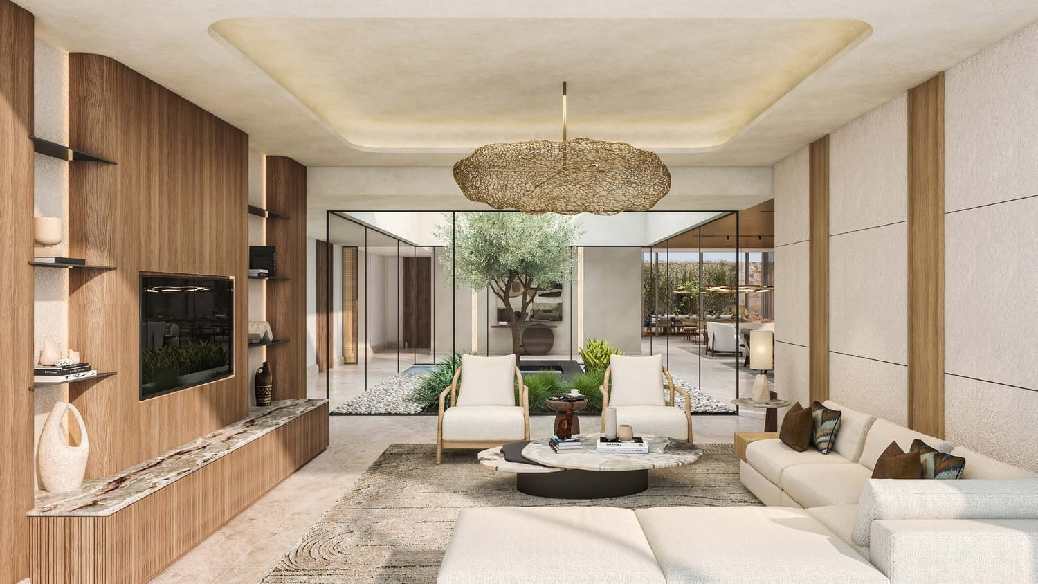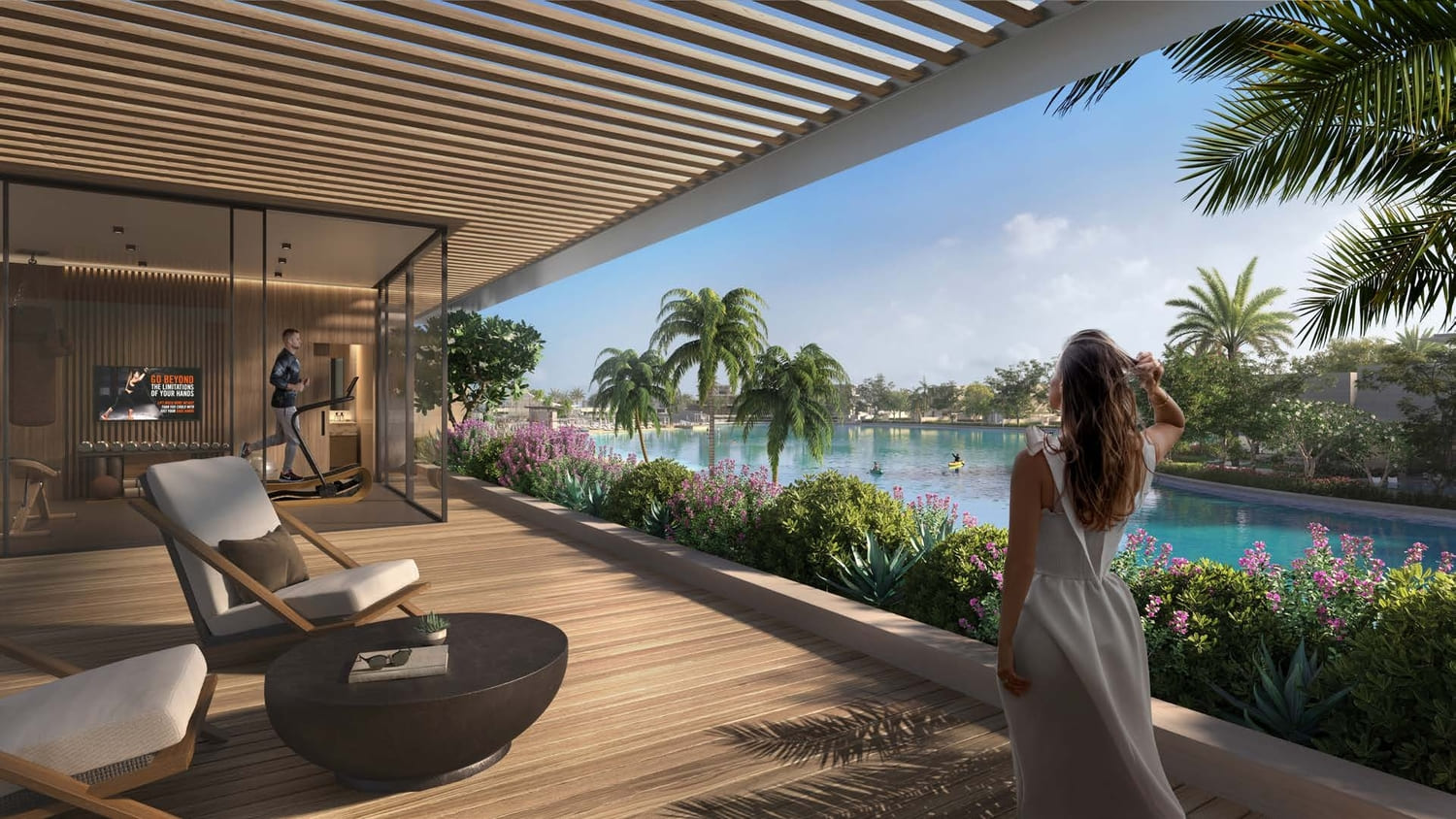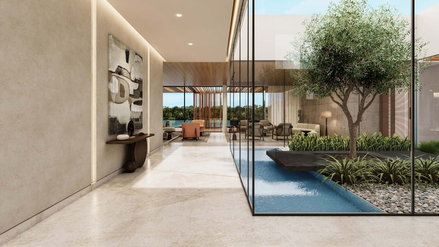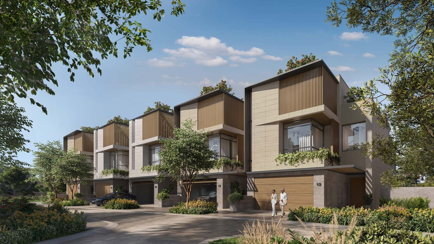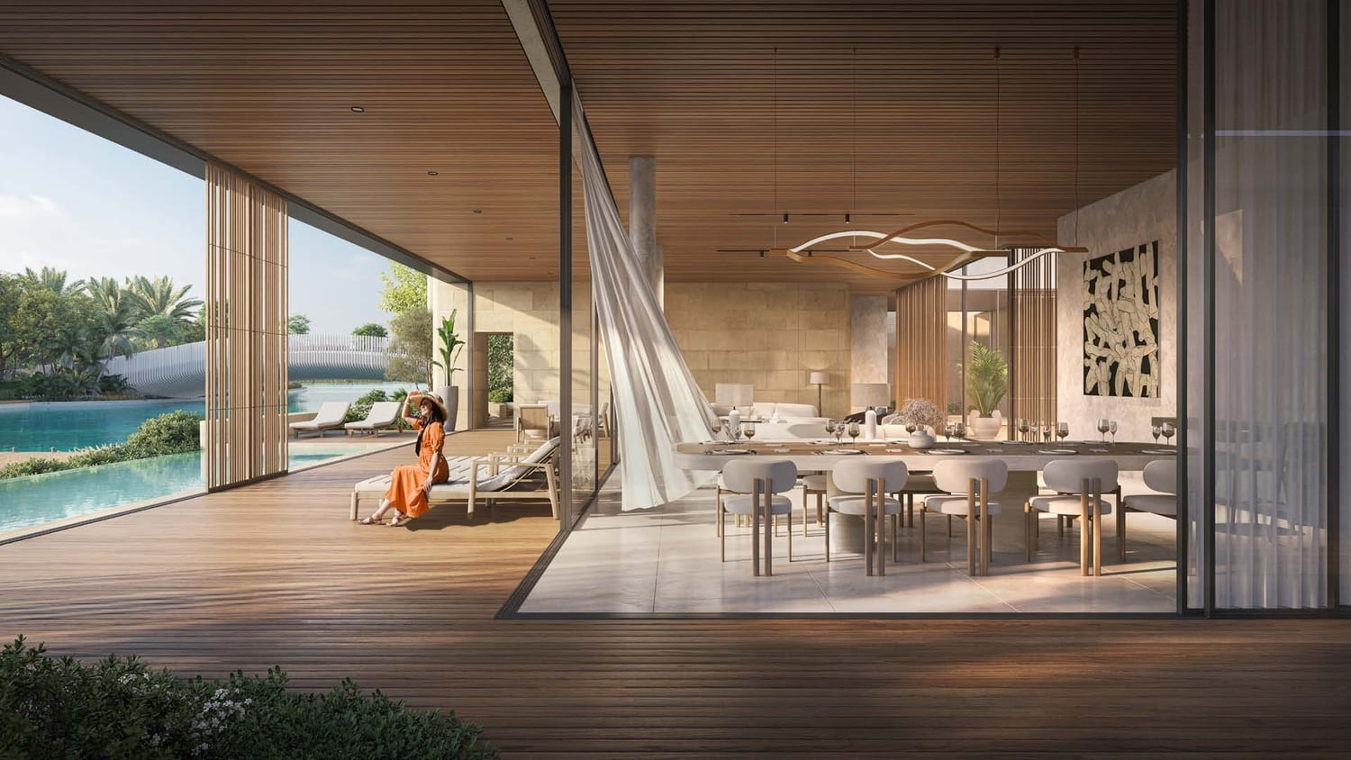 Bespoke with a French touch, these 28 three-floor villas follow the snaking contours of the masterplan. They introduce greenery into the living quarters, oriented towards the lagoon on one side, and the park on the other; optimally framing the scenic landscape. The scenography of the living experience is set up with a procession of single and double height spaces leading from the entrance to the garden and the beyond, combining contemporary design with luxurious comfort. Optimal for a summer retreat.