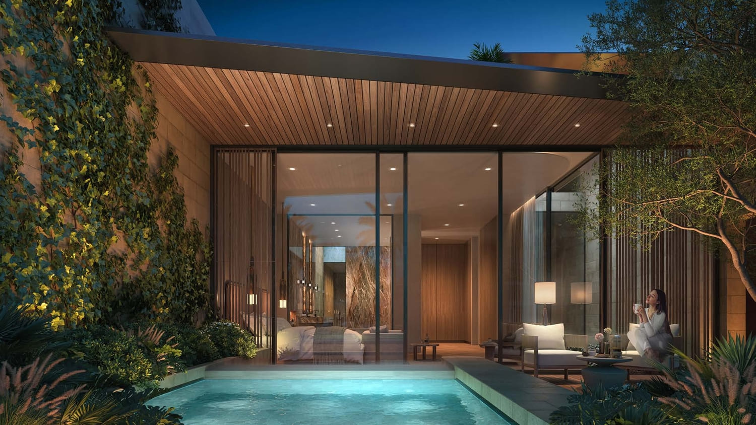 The 4 exclusive bungalows line the edge of the serene sandy lagoon, offering direct access to its crystalline water and neighbouring beach club. A series of hammered stone walls creates a playful rhythm and an iconic design where each bungalow boasts its own private garden, outdoor patio and pool. Purposefully grounded and blending within the natural topography, this intimate retreat is a wonderous haven for personal well-being. Its intricate designs are characterised by light and an organic palette with Zen influences gives you a sense of comfort.