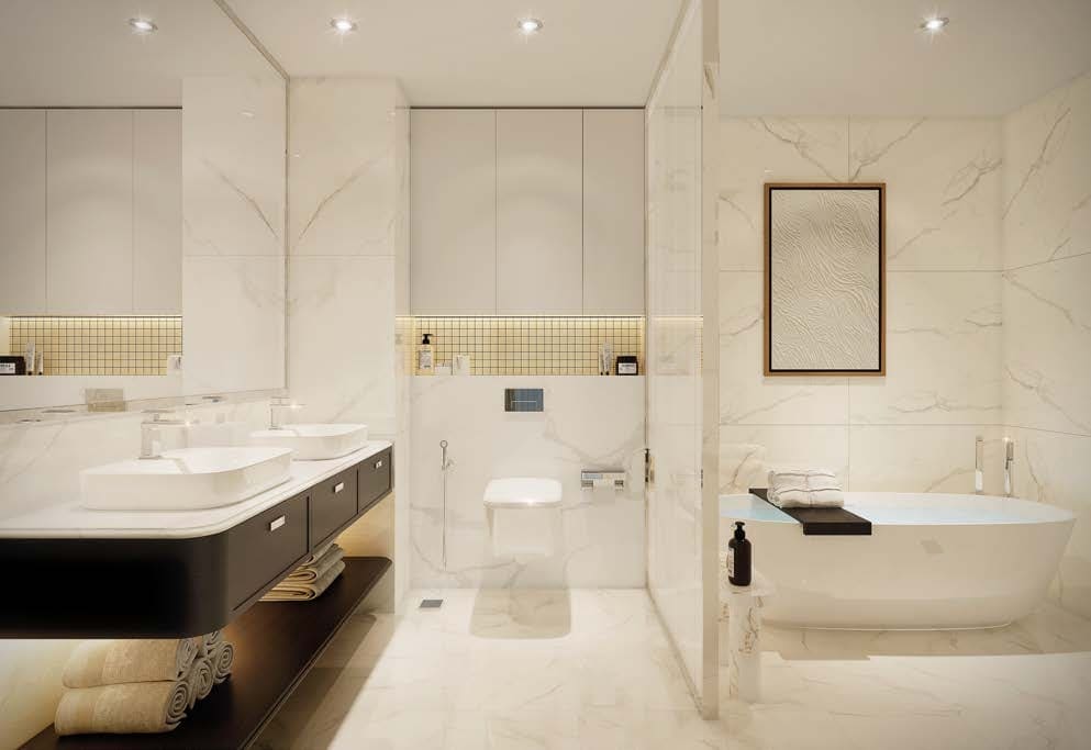 Solar-reflective glass facade with green galleries. Grand lobby with marble interior. Modern hotel design entrance Lobby with valet parking Apartments finished with precious Italian marble. Bathrooms are finished in porcelain (floor and walls) with marble mosaics and champagne finishes and exquisite fittings. Ceiling height 3.1m Entering the door with smart card Smart home control for cooling, lighting and home appliances. Smart building management for access to common areas.