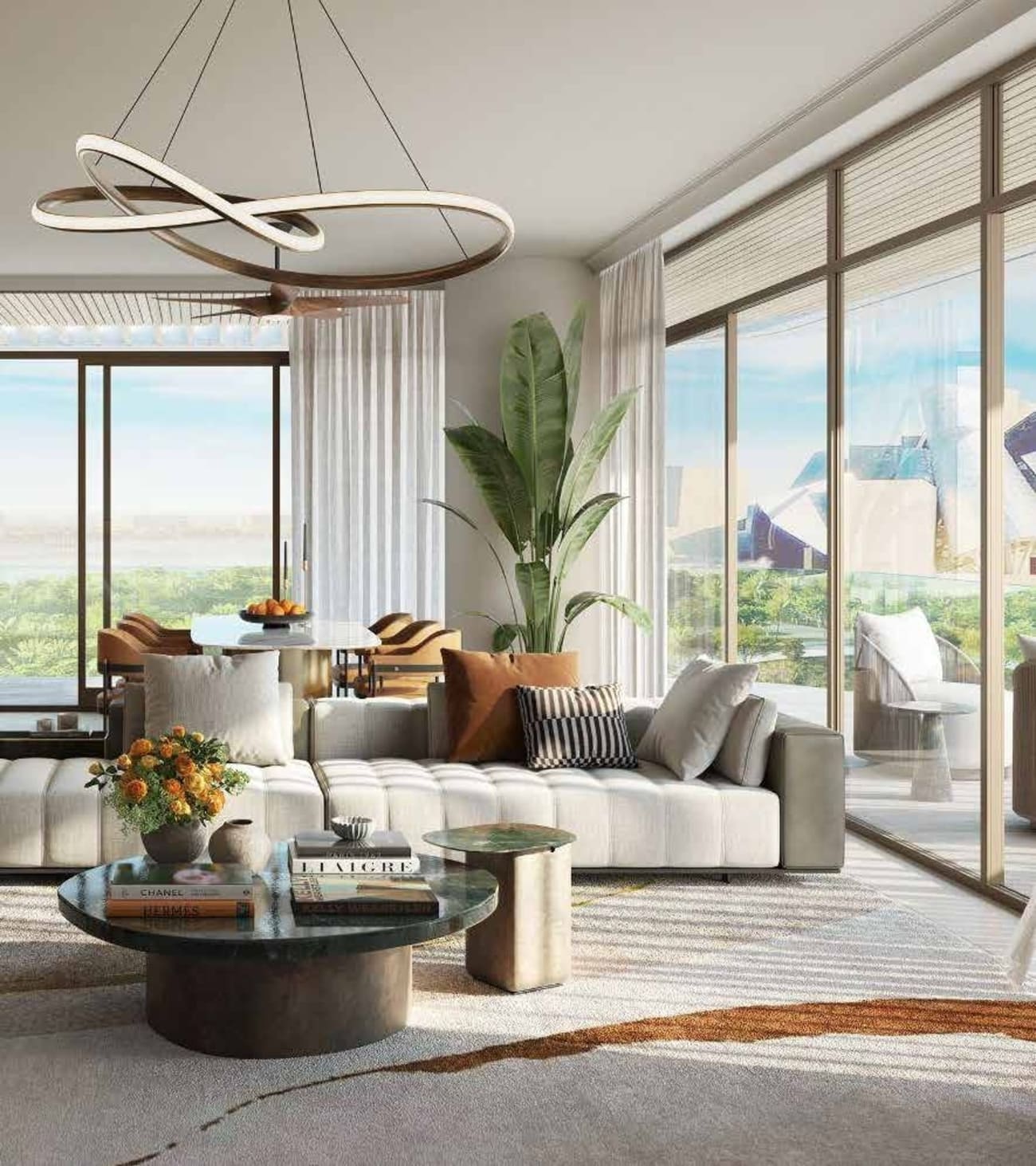 Interiors combine premium materials with clean contemporary lines, creating warm yet refined living spaces that serve as a canvas for daily life. Floor-to-ceiling windows and expansive balconies enhance natural light and open views toward museums and the Arabian Gulf. Kitchens are delivered fully equipped, integrated seamlessly into the overall interior design. Residences are offered unfurnished, allowing owners the flexibility to personalize their living spaces.