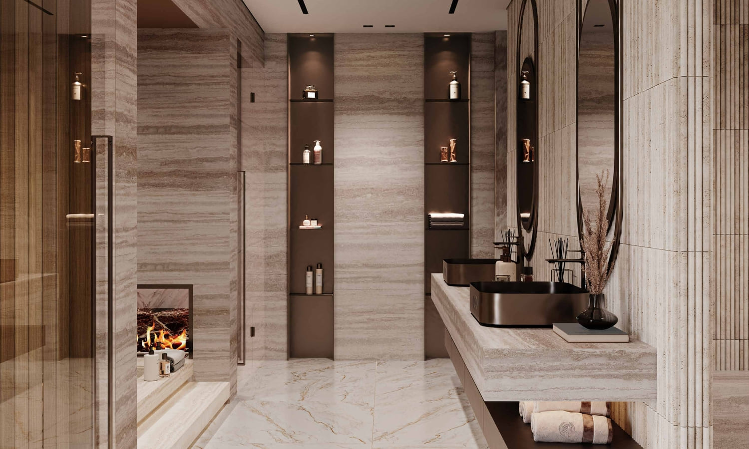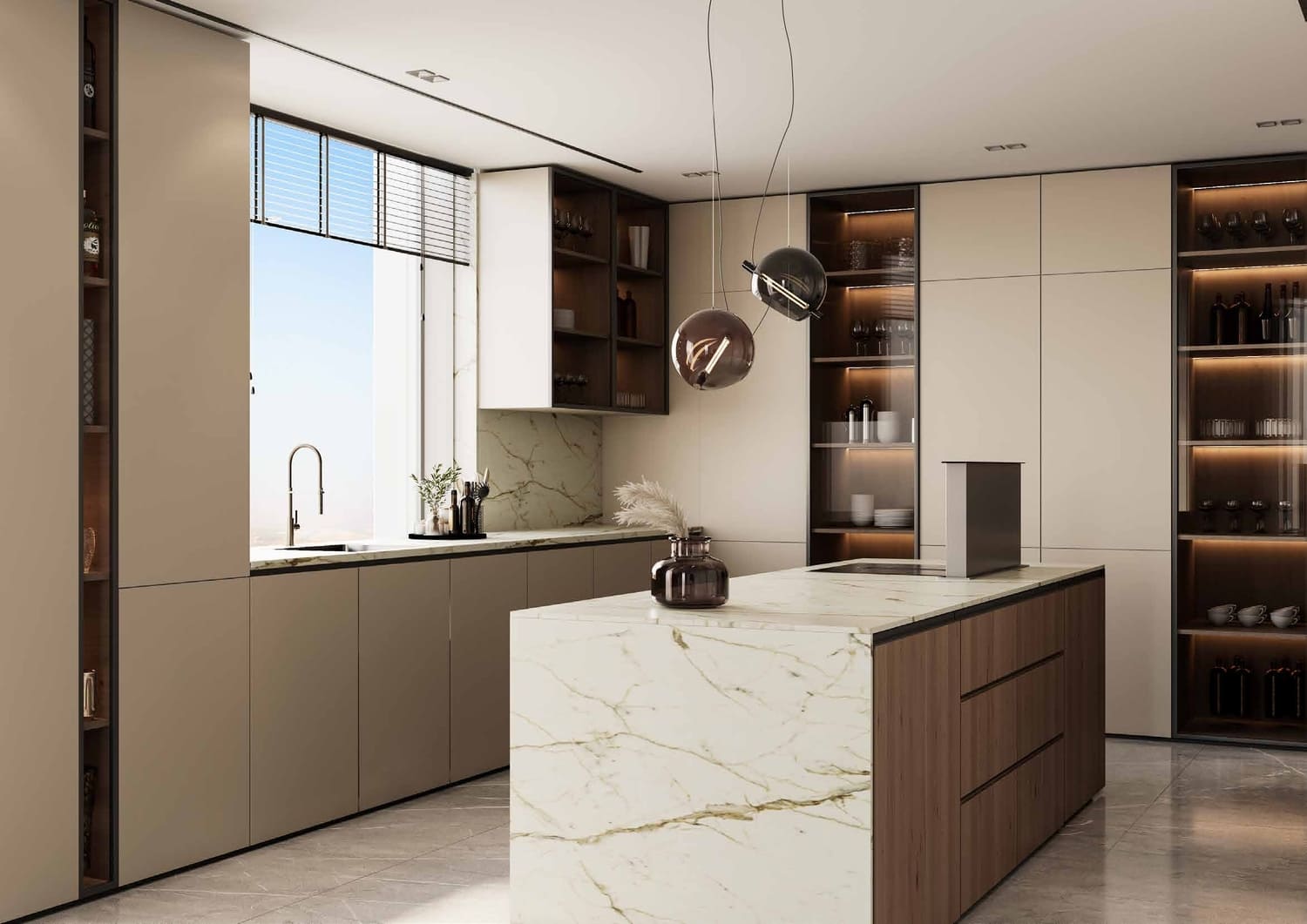 The kitchen spaces at Franck Muller Aeternitas Tower have been designed to be highly functional and durable, while providing the desired luxury and class. High-quality materials and equipment have been selected to create smart storage spaces and luxurious countertops, with finishes that enhance the aesthetic value as well as their functional use.
