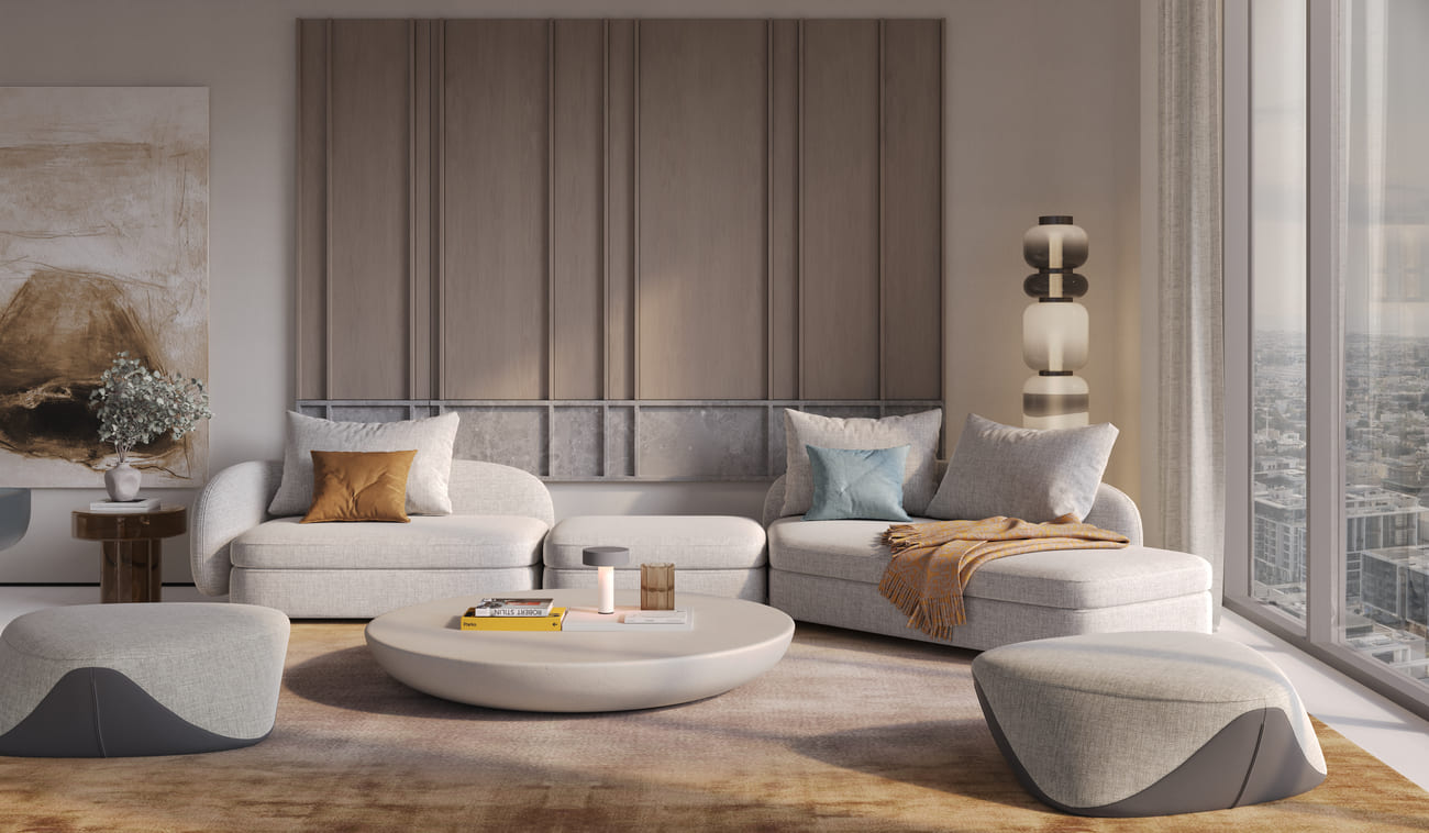 A stunning array of lush, manicured landscapes featuring rare botanicals and bespoke art separates the upscale F&B drop-off point from the private, residents-only drop-off area. Minimalist elegance meets understated warmth inside the grand, double-height lobbies, crafting a regal ambiance that speaks volumes. Step inside and let the serene tones and sleek design guide you into your tranquil abode.