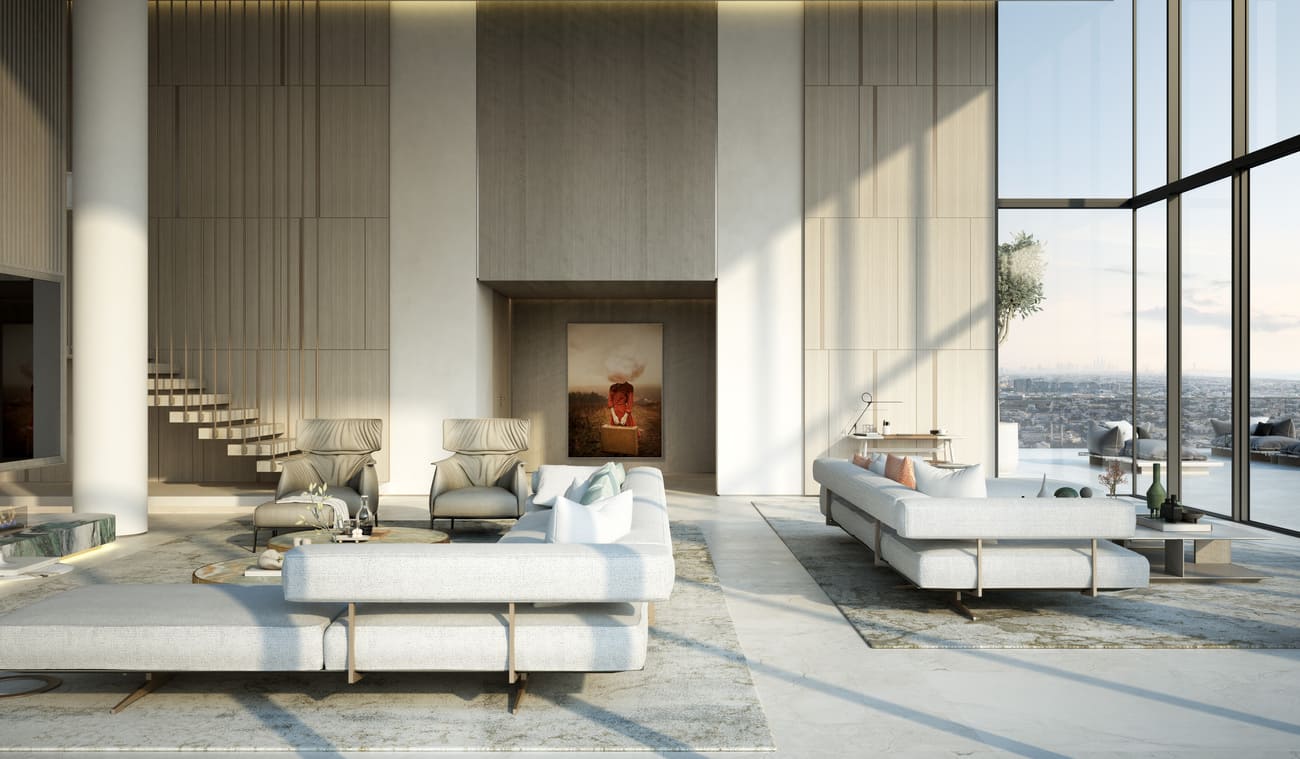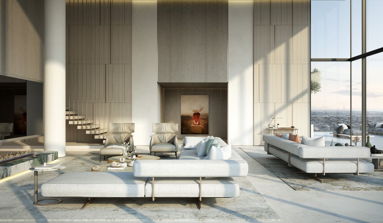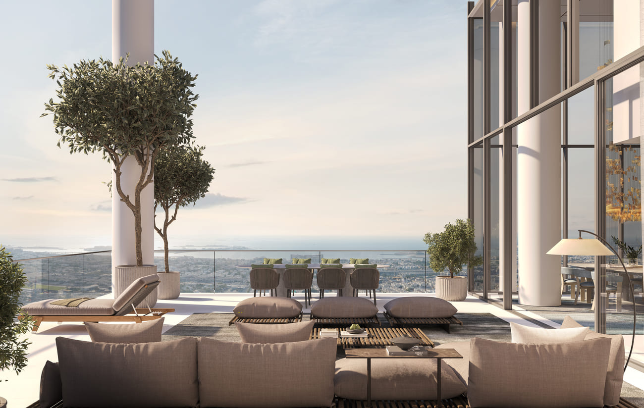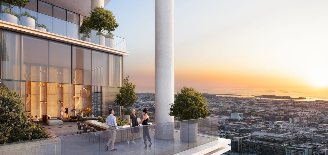 Distinct special units in the unique cut-outs offer double-height living spaces and stunning views. Imagine waking up to a panoramic tapestry of the Dubai skyline, with sunlight cascading through floor-to-ceiling glass that blurs the line between your home and the vibrant city.