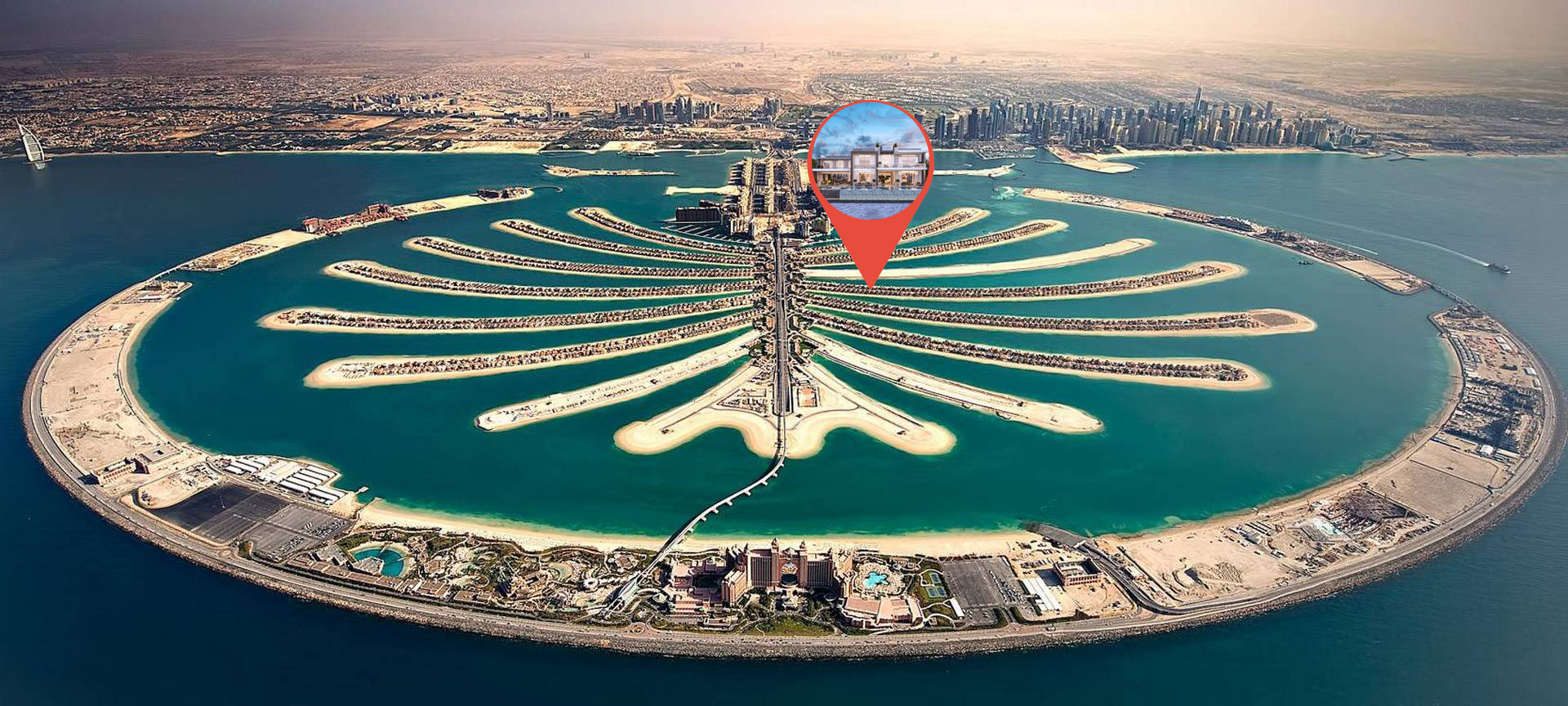 Palm Jumeirah is a luxurious community located on an artificial island that is shaped like a palm tree, with a trunk, fronds, and a crescent-shaped breakwater that surrounds the island.