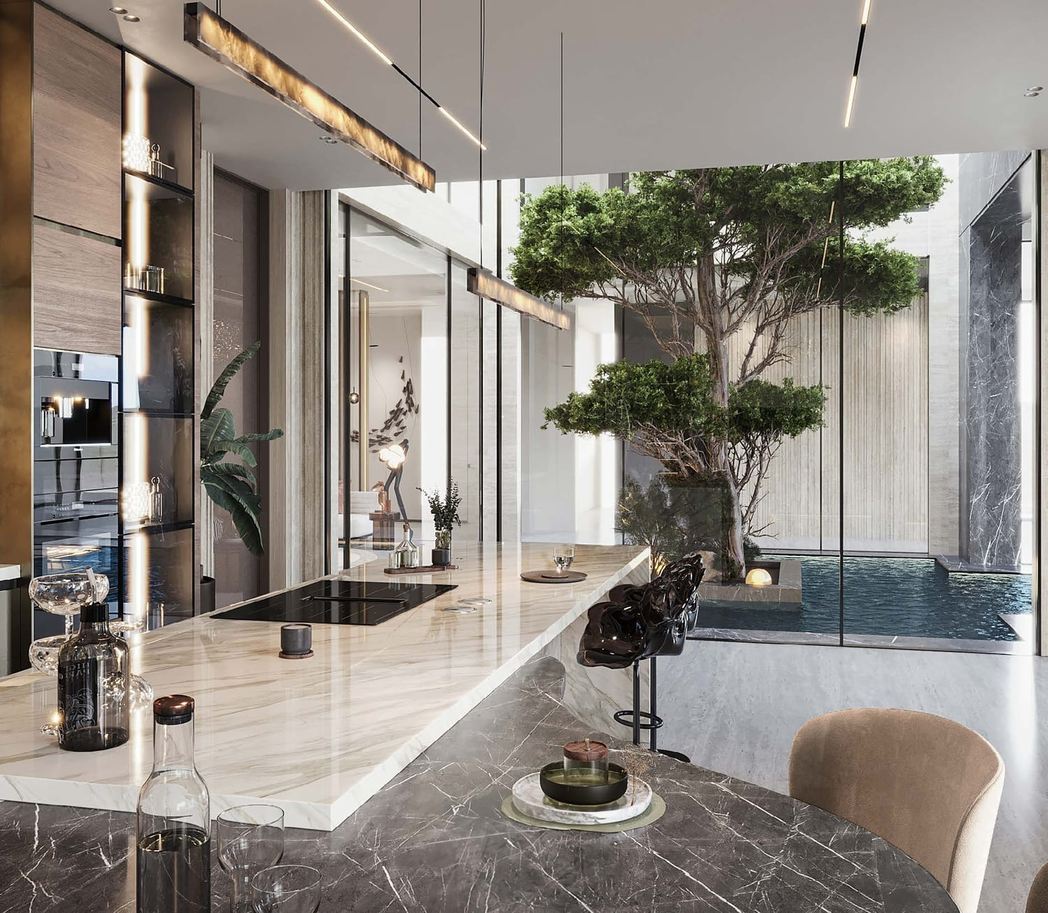 Residents can enjoy the private al fresco wonderland at the water’s edge, relax on a comfortable sofa amid velvet walls in the home cinema, entertain guests in the formal indoor areas, or delight in the roof deck views of the infinite sea or the glittering urban skyline.