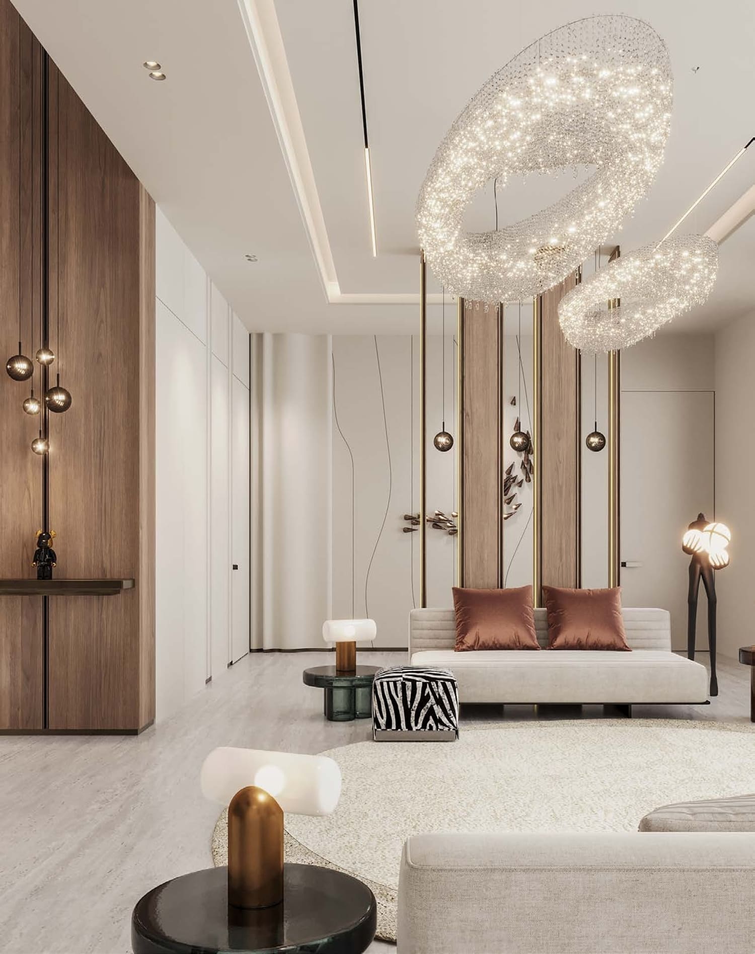 Sofas and poufs by Minotti, lamps Roche Bobois Amor, rugs from Gallotti&Radice, Connubia Calligaris Miro mirrors.