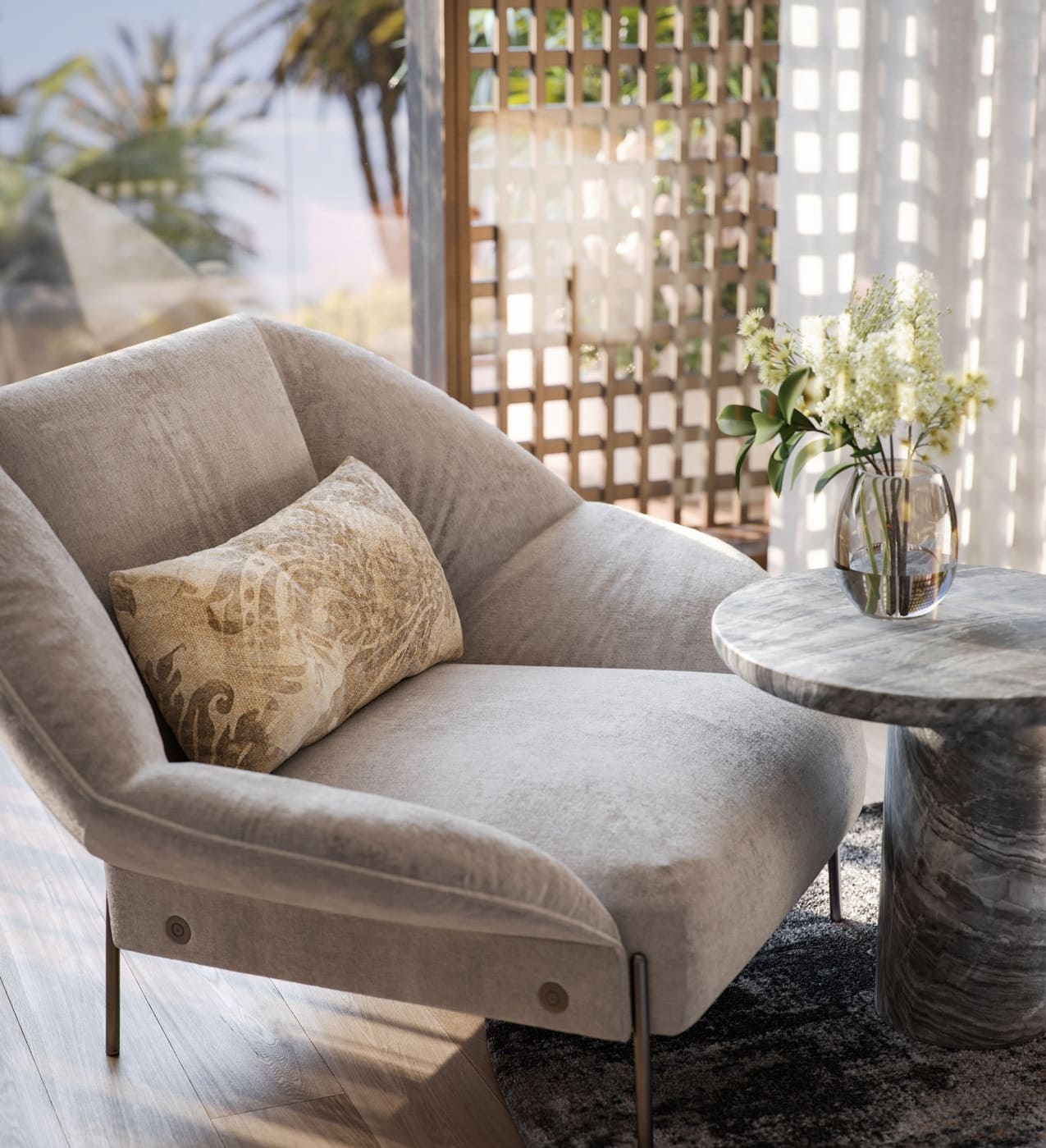 Wooden elements bring warmth to cosy yet palatial rooms where the avant- garde lighting adds a touch of modernity. Throughout this extravagant mansion, space unfurls into indulgent comfort with materials selected for their prestigious quality and enriching textures.